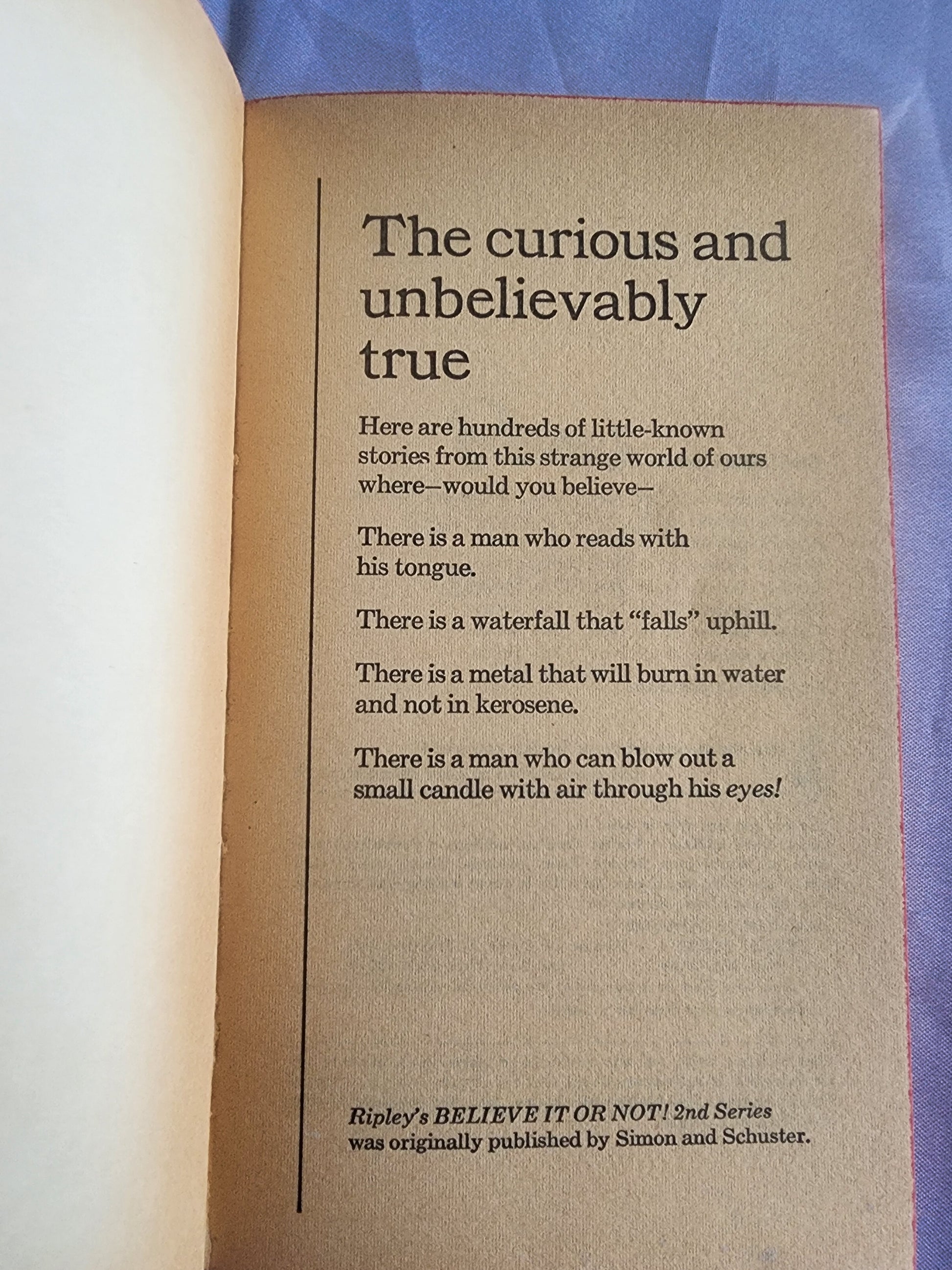 * "This collectible paperback features classic Ripley's oddities and curiosities, perfect for fans of the unusual and collectors of vintage paperbacks."