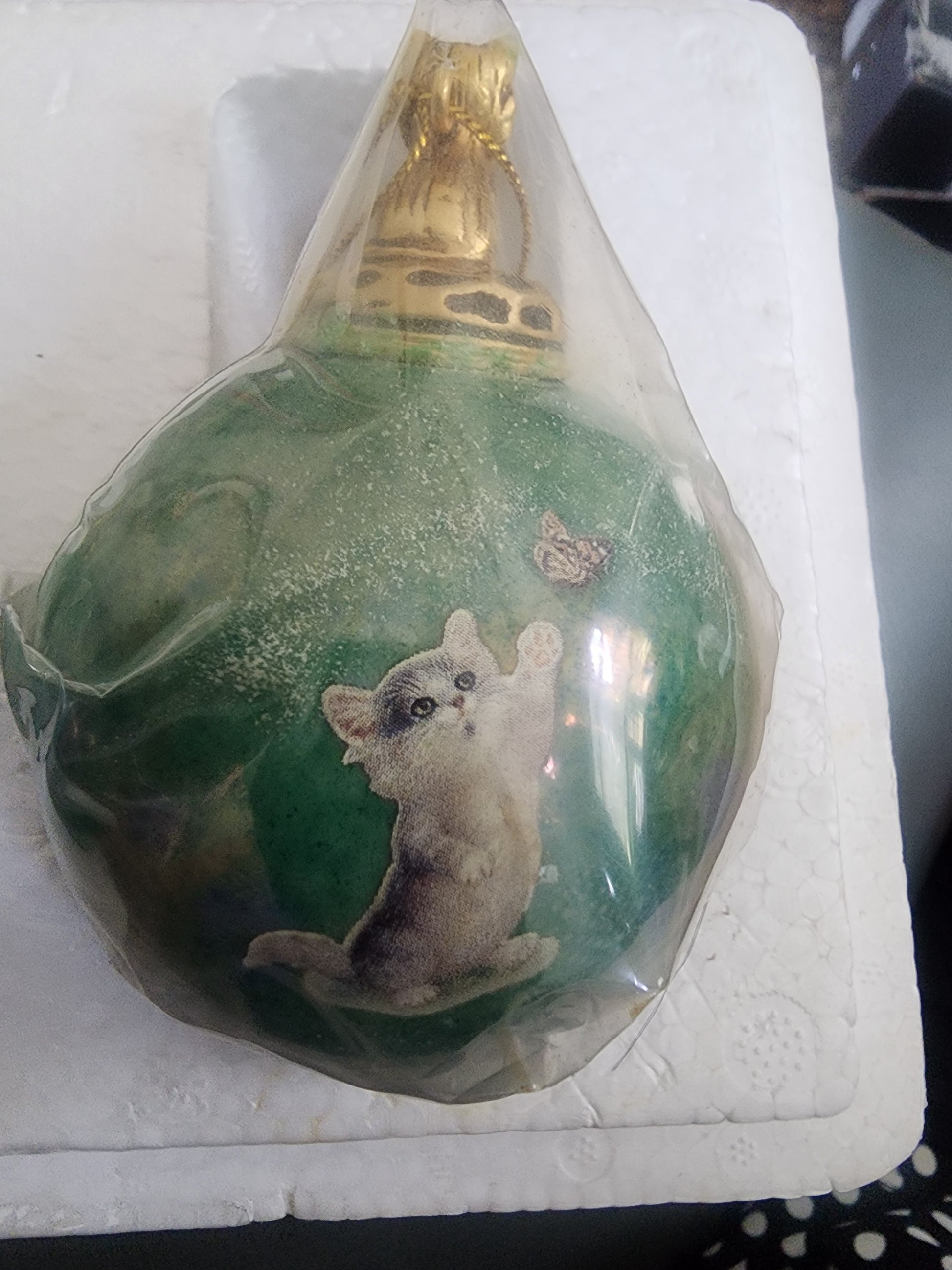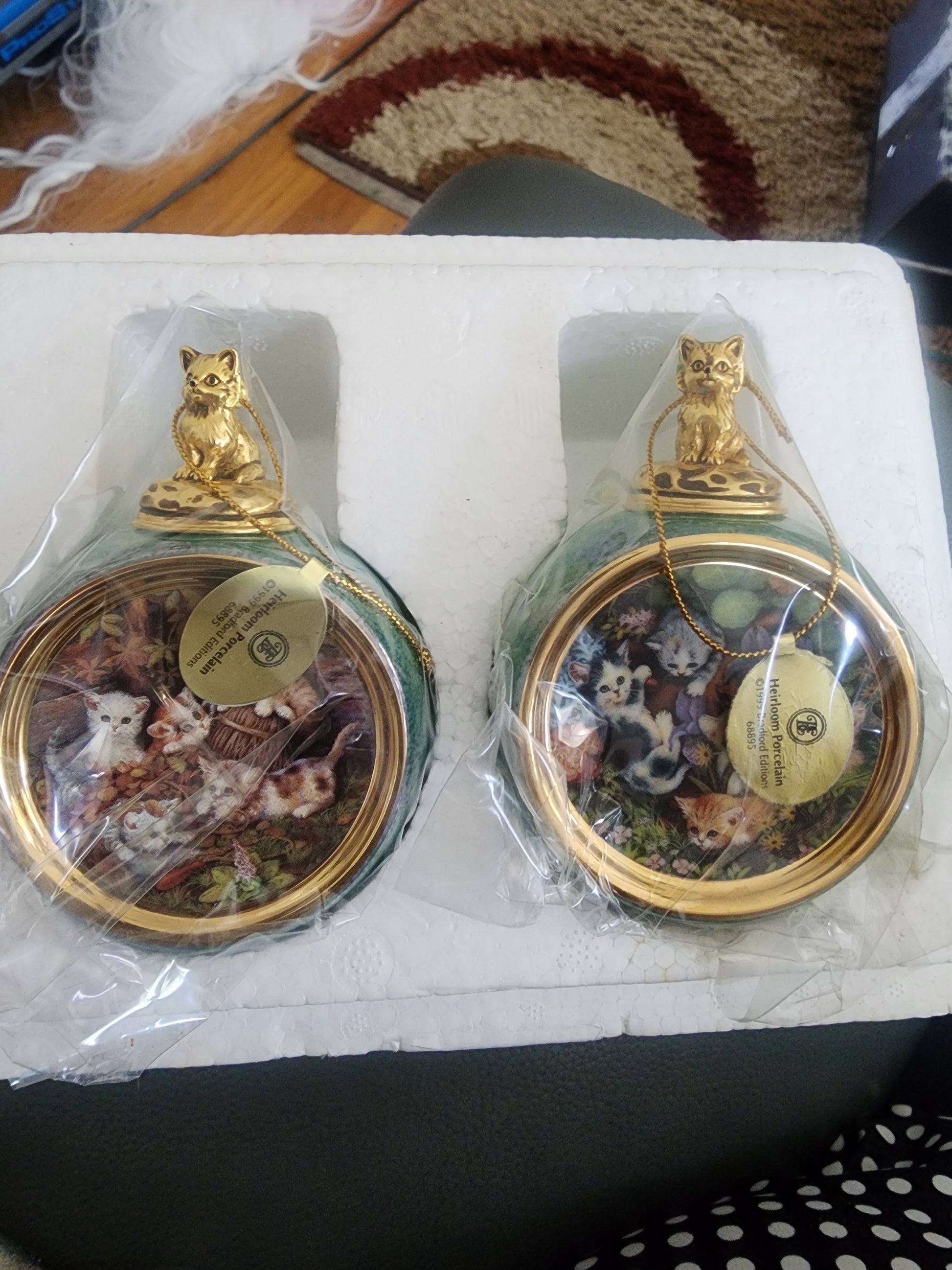 <span;>Bring a touch of heartwarming charm to your home with this pair of Vintage Bradford Exchange porcelain hanging ornaments from 1999. Each round ball ornament showcases a delightful scene of playful kittens, Flower fantasy & Autumn Escapade bordered by a gold color trim and soft green and topped with a sweet figural cat. These ornaments are in excellent, like-new condition and perfect for cat lovers or collectors.