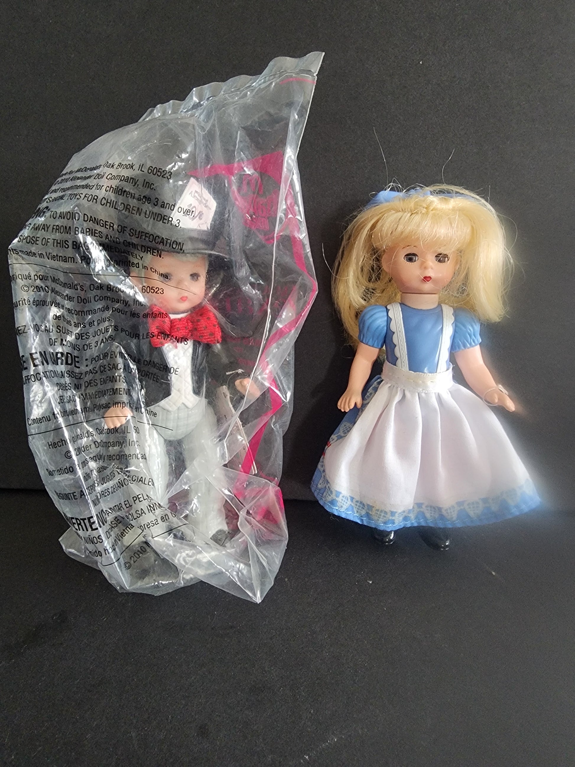2010 MADAME ALEXANDER ALICE IN WONDERLAND MAD HATTER DOLLS MCDONALDS HAPPY MEAL 5" Alice preowned with normal wear, the Mad Hatter is new in package.
