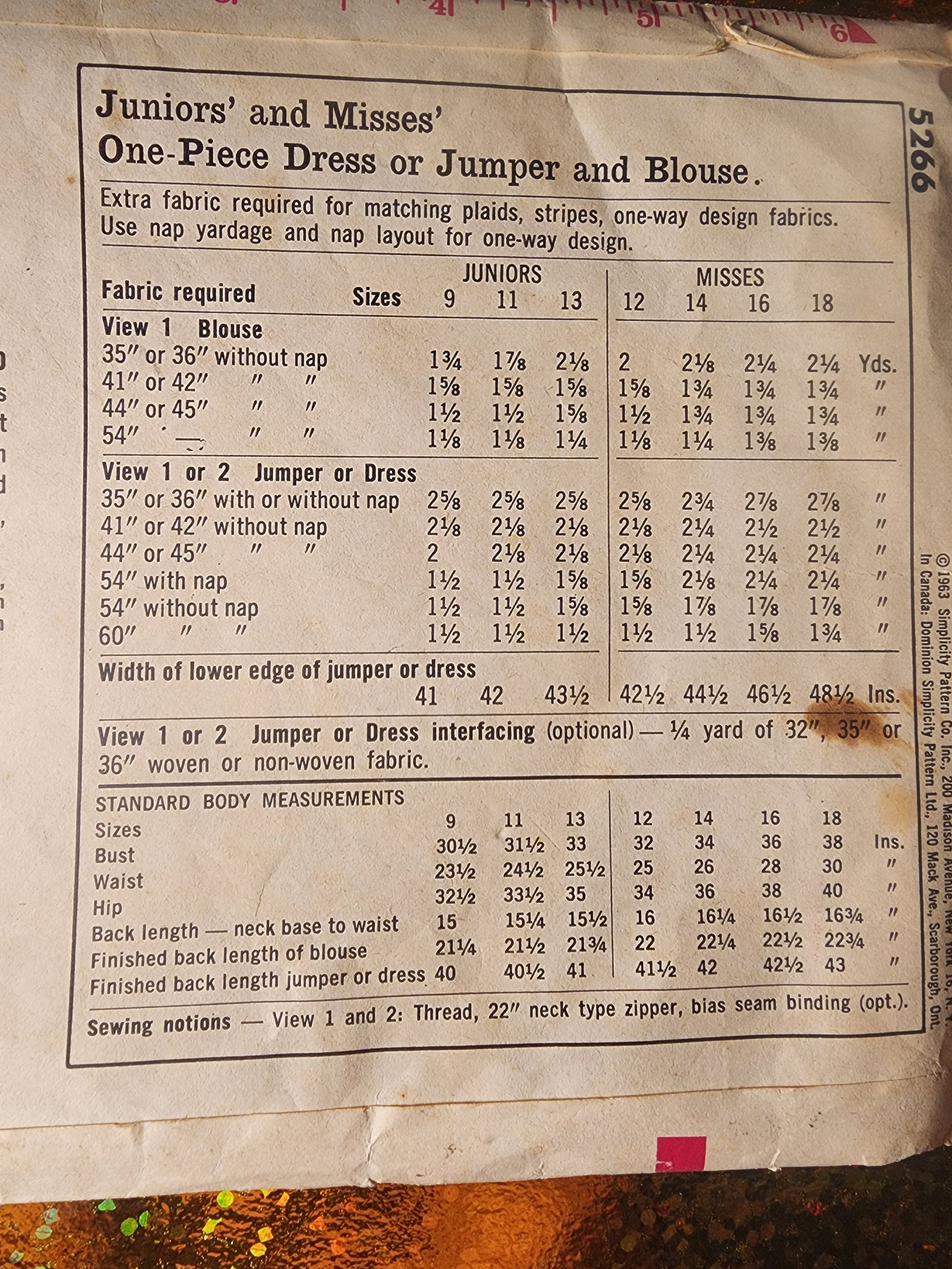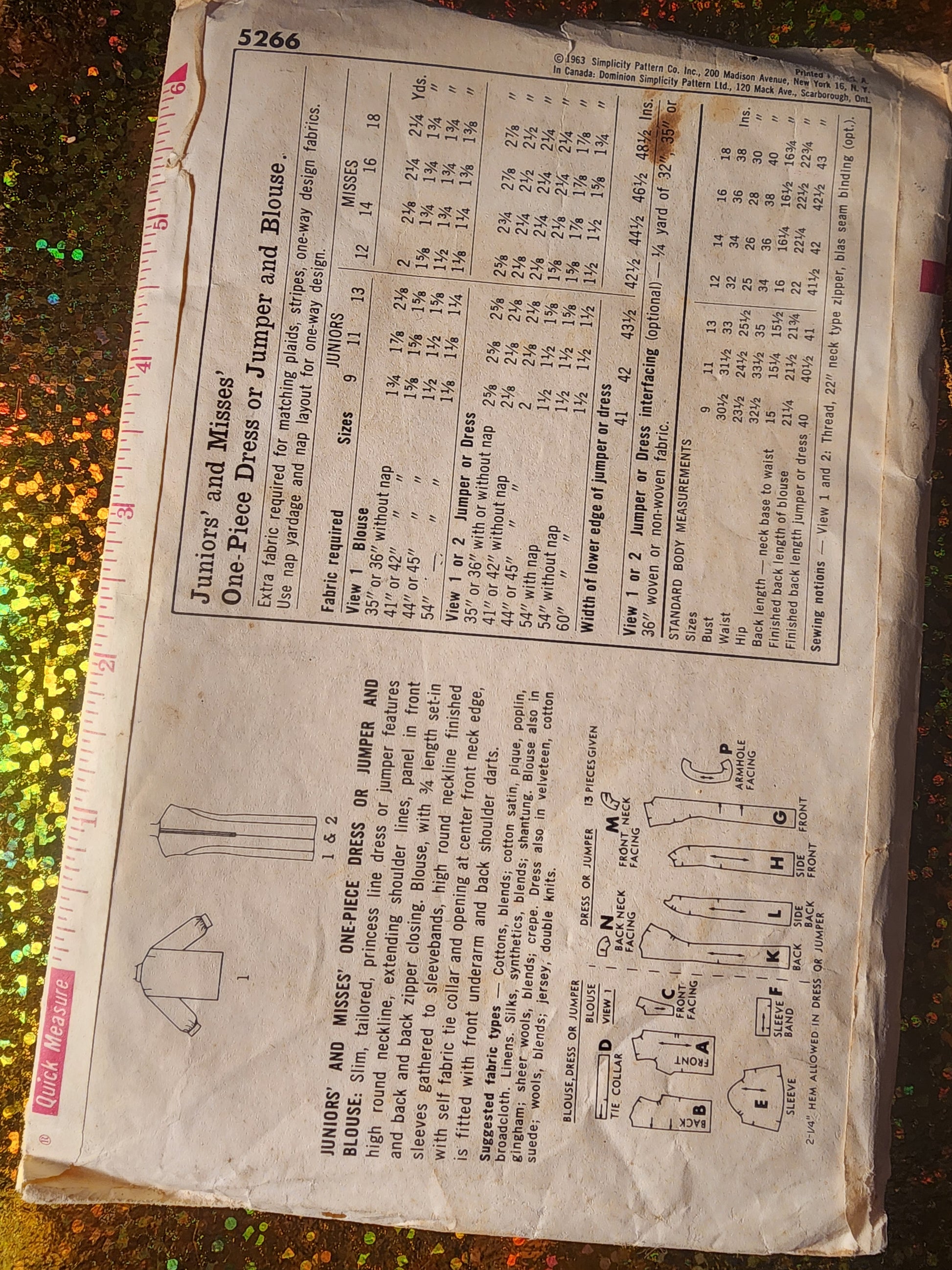 5266 Vintage Simplicity SEWING Pattern Misses 1960s Dress Jumper Blouse Sz 12 bust 32 waist 25 hip 34 uncut Pattern, envelope has slight wear.