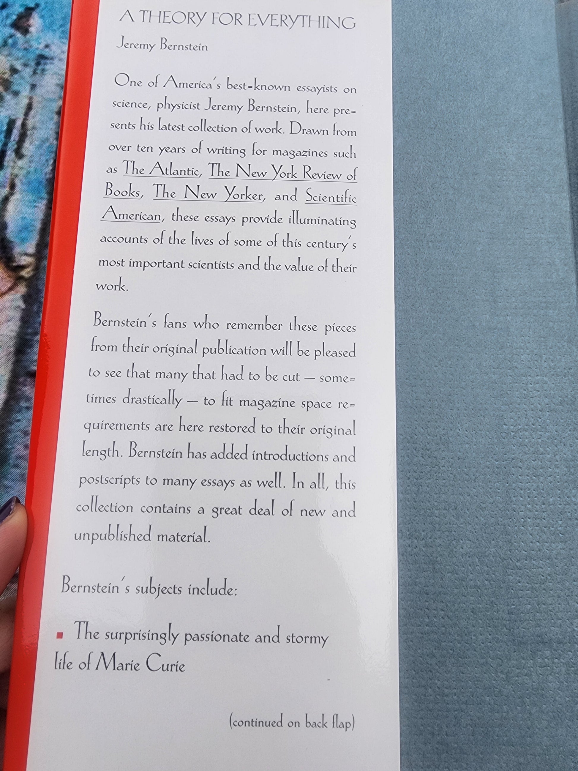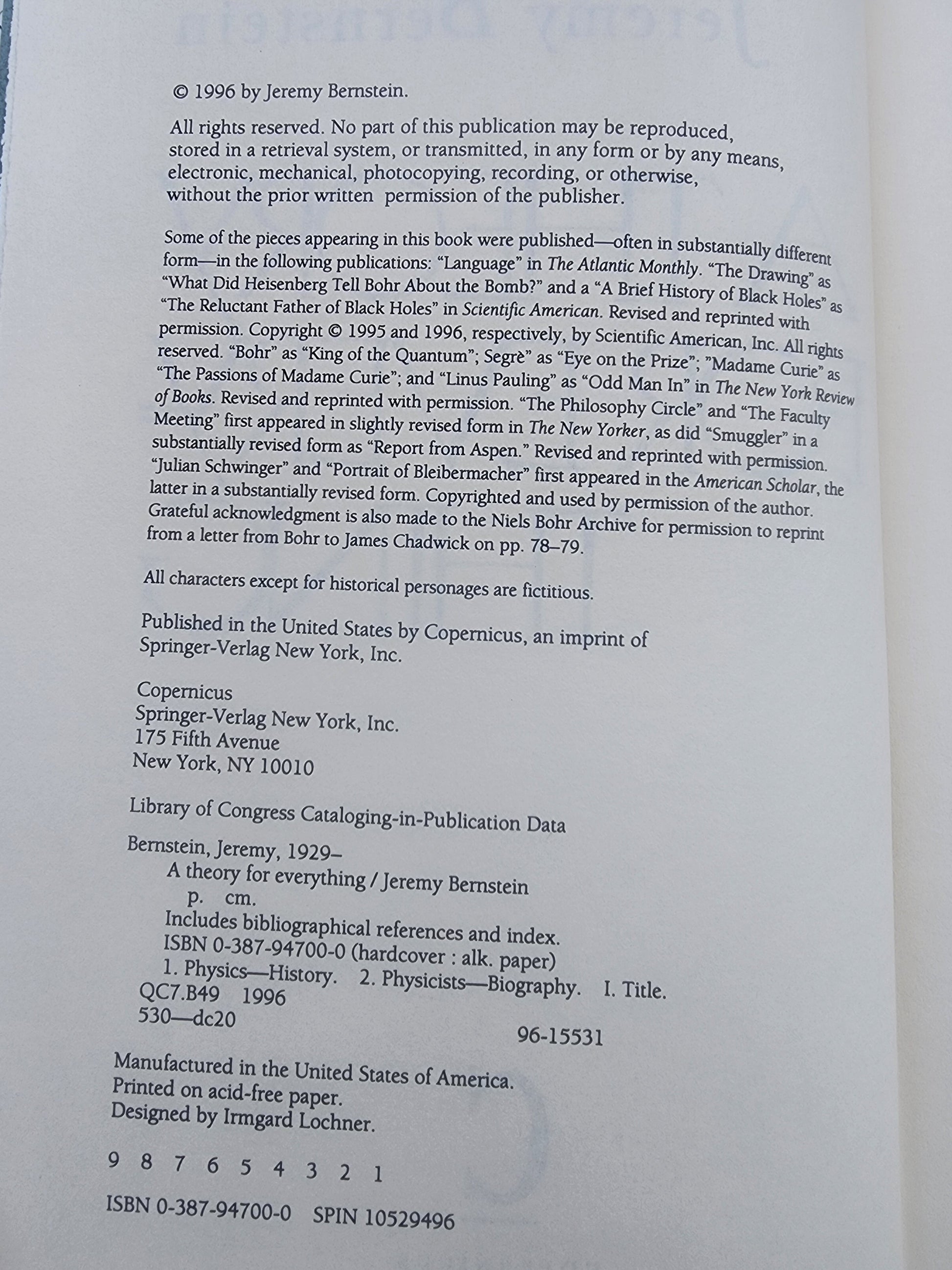 Delve into the fascinating world of science with "A Theory for Everything" by the distinguished essayist Jeremy Bernstein. This hardcover edition presents an intriguing collection of essays, offering insightful perspectives on science and its rich history. A must-read for anyone curious about the big questions and the brilliant minds exploring them.