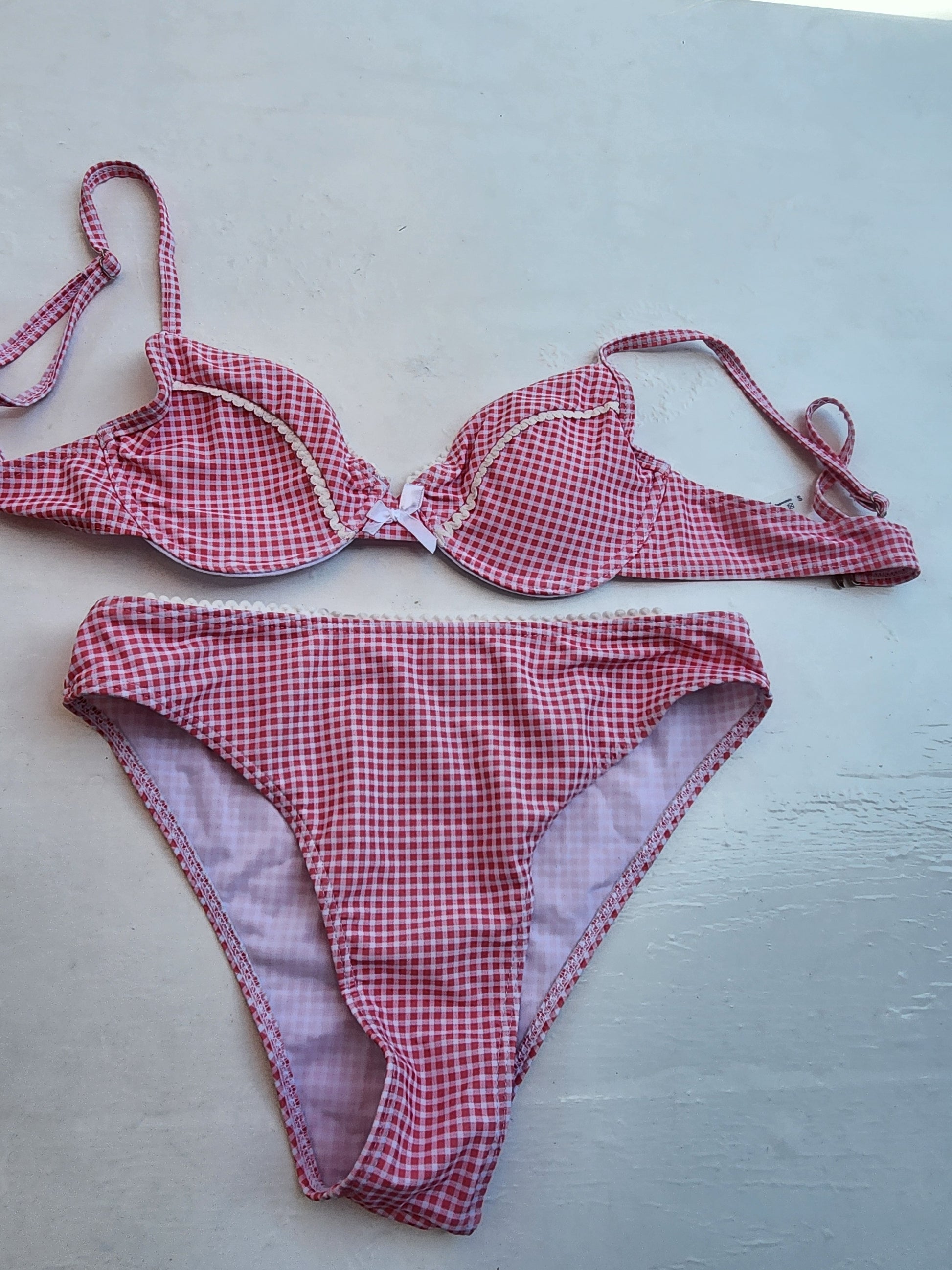 Adorable Pink & White Gingham Plaid Bikini Swimsuit Set - Top Small, Bottom Med