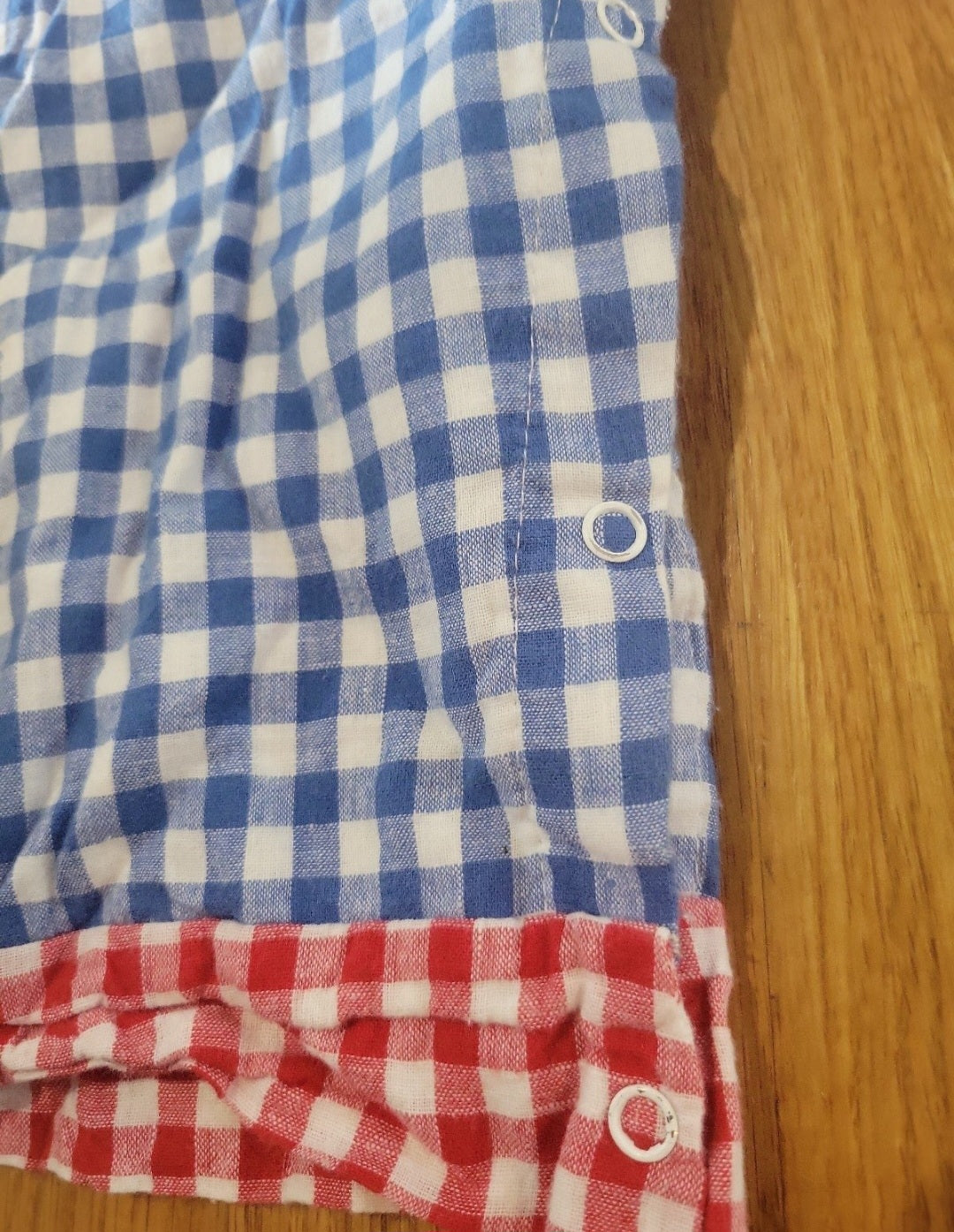 <span;>Boys Mudpie 2T-3T blue red gingham plaid tuck romper, rin good condition. Metal snaps up the leg. Pit to pit 10". From top to bottom 25"