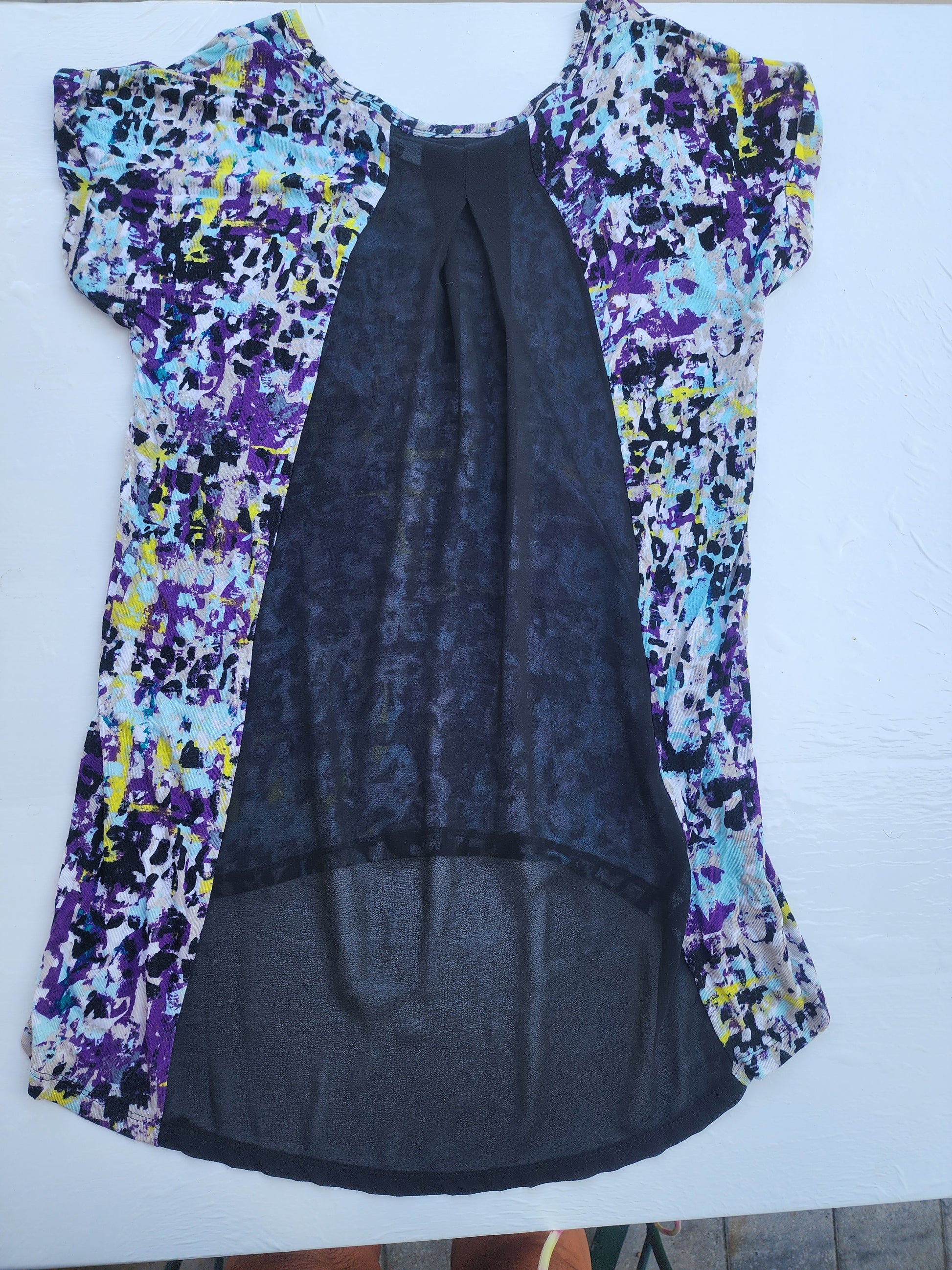 <span;>Designed with a comfortable v-neckline and short sleeves, this top boasts a stylish high-low hem, offering a flattering silhouette. The back panel appears to be a solid black sheer, adding a touch of elegance. Measurements pit to pit 17.5", top to bottomin front 22.5" in back top to bottom 27.5"