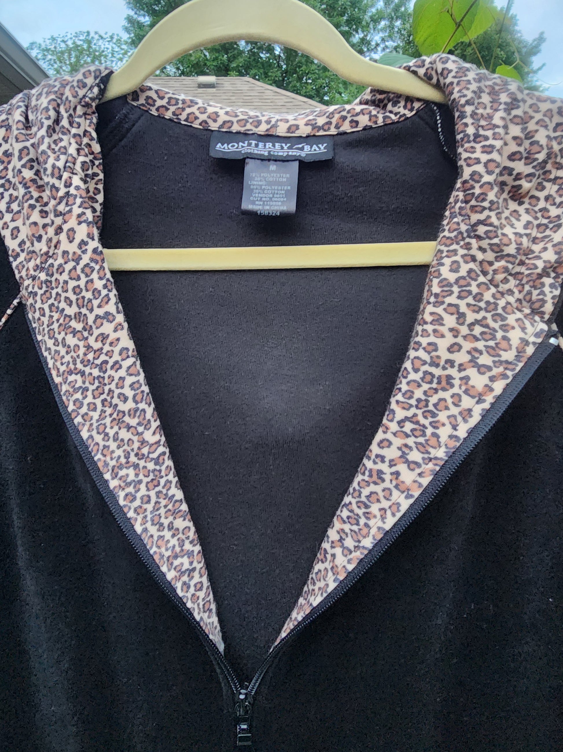 <span;>Classic black with a fun, eye-catching leopard print hood and pocket trim.