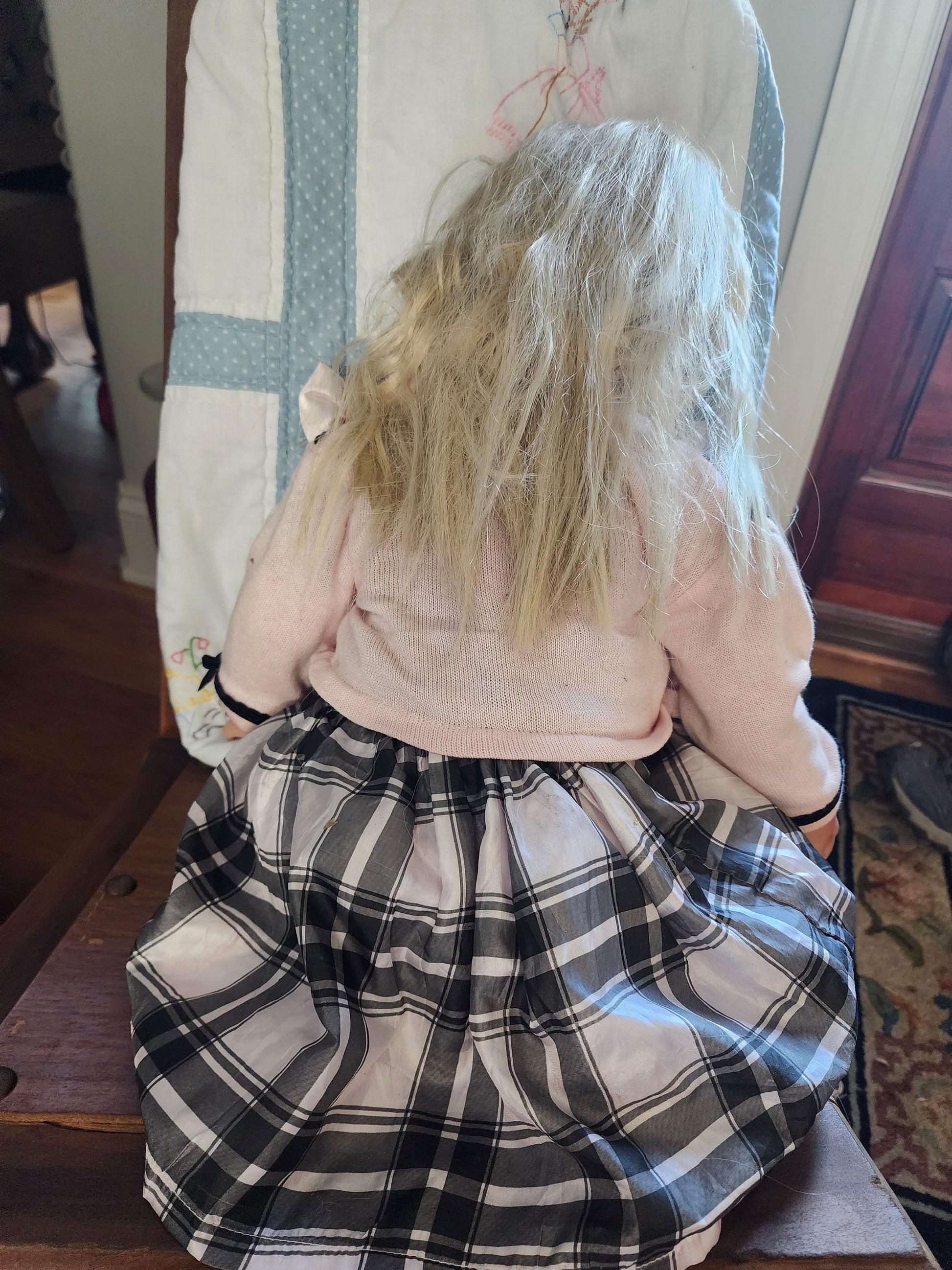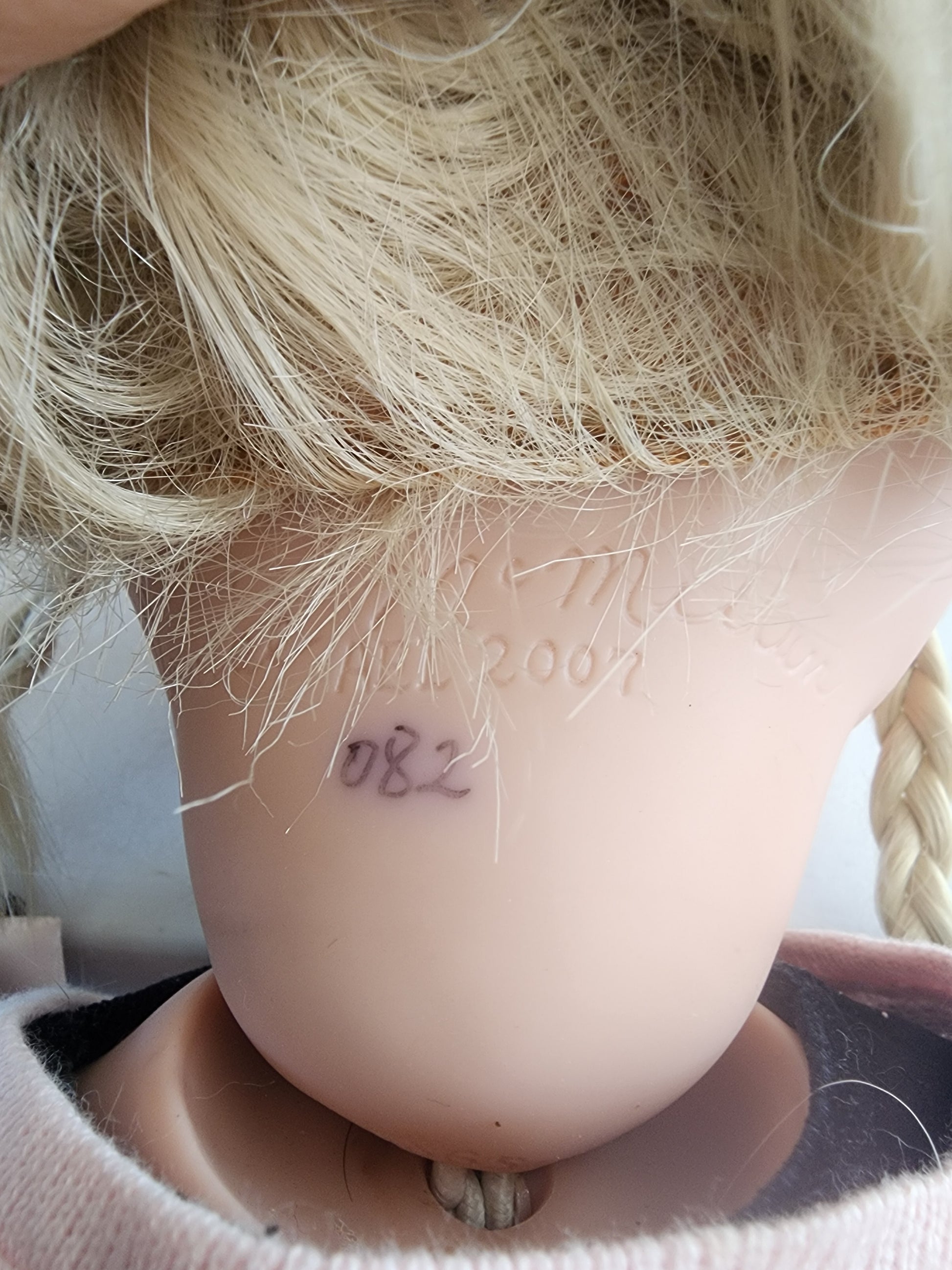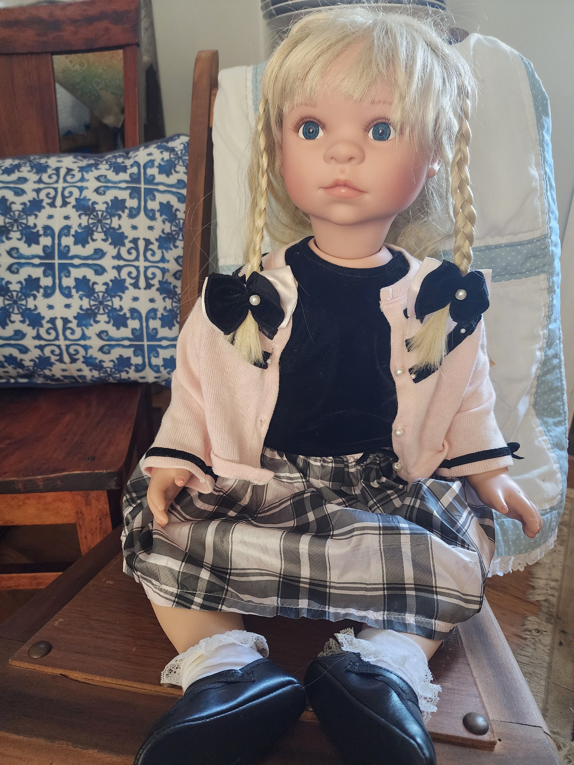 <span;>This 25" Denise McMillan doll is a must-have for collectors and doll enthusiasts alike. With her blonde straight hair and blue eyes, she is a stunning addition to any collection. This artist doll is made from high-quality vinyl and cloth materials, ensuring her durability and authenticity. Her sweater is missing a top pearl and has gotten dirty, other than that she is in good condition.