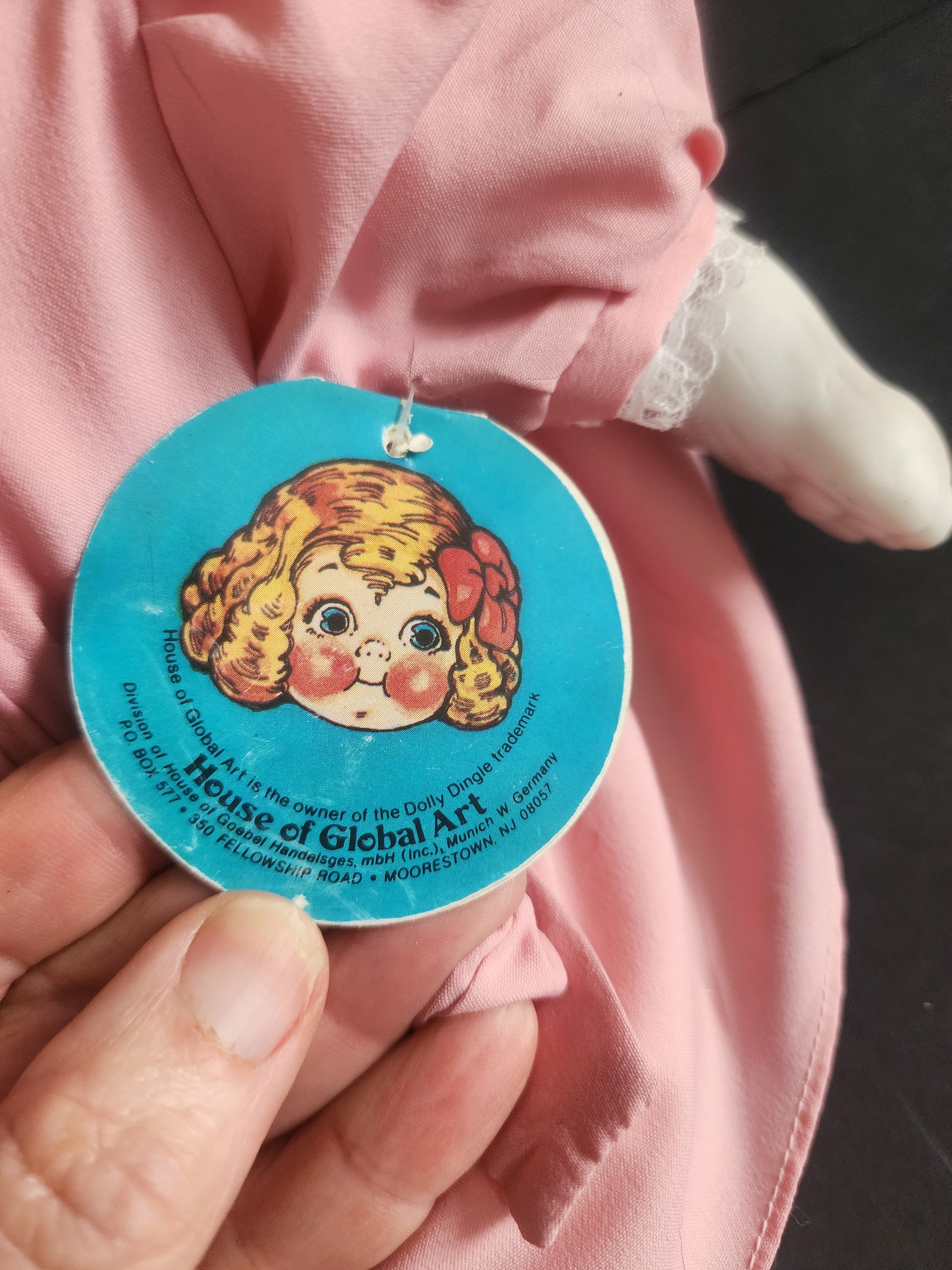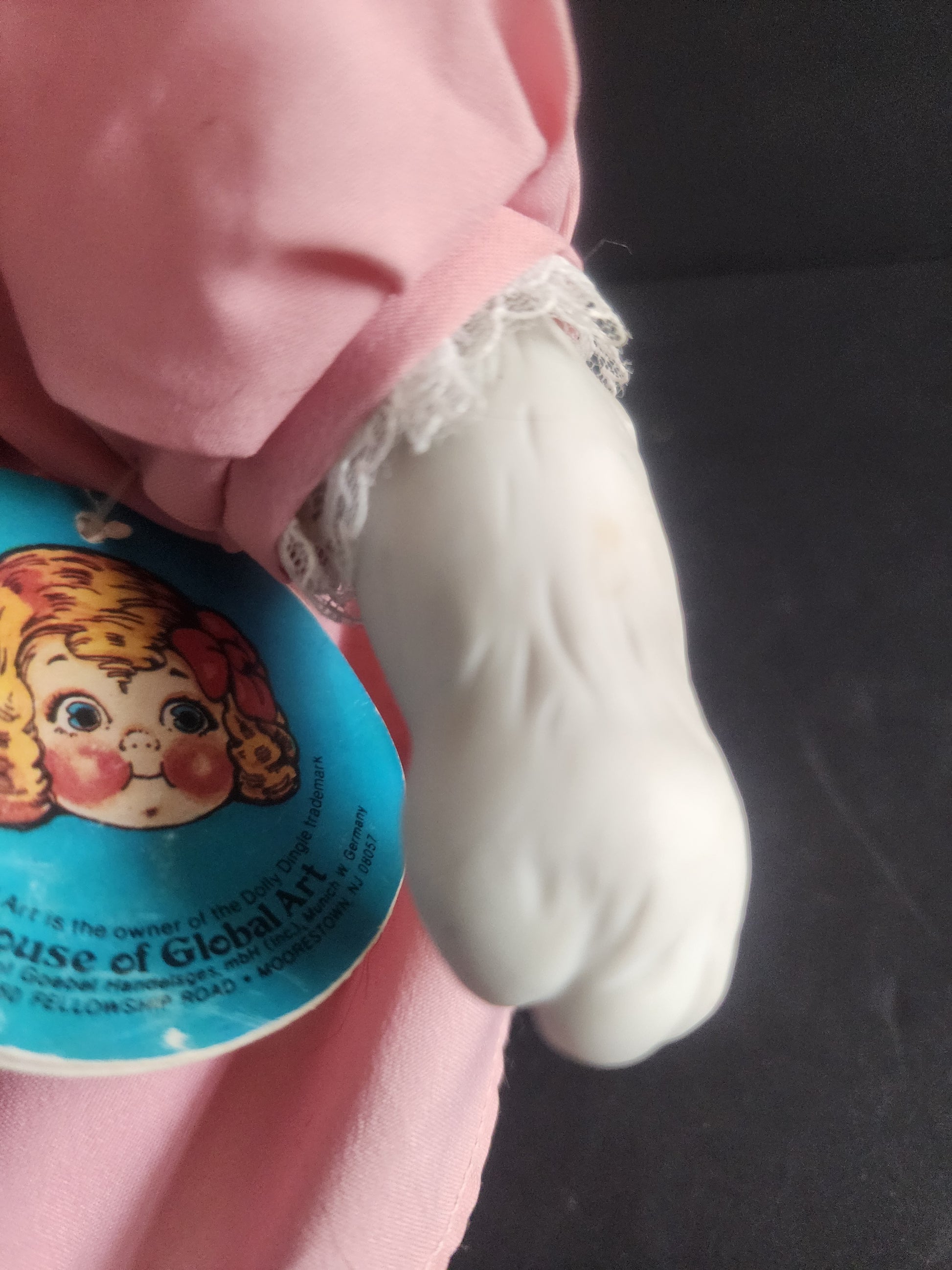 The Dolly Dingle's Kittie Cuti Porcelain Musical Cat Doll is a vintage collector's item from 1983. This limited edition doll, measuring 8 inches in size sitting up,, features a white porcelain body with blue eyes and a soft complexion. Signed by its creator, this musical doll plays a tune when wound up and comes with original clothes. Plays Someday my prince will Come. Sounds good. Manufactured in Germany, by the division of Goebel, this unique porcelain doll with a cat character is perfect for all occasions and is sure to delight collectors of musical and limited edition dolls.