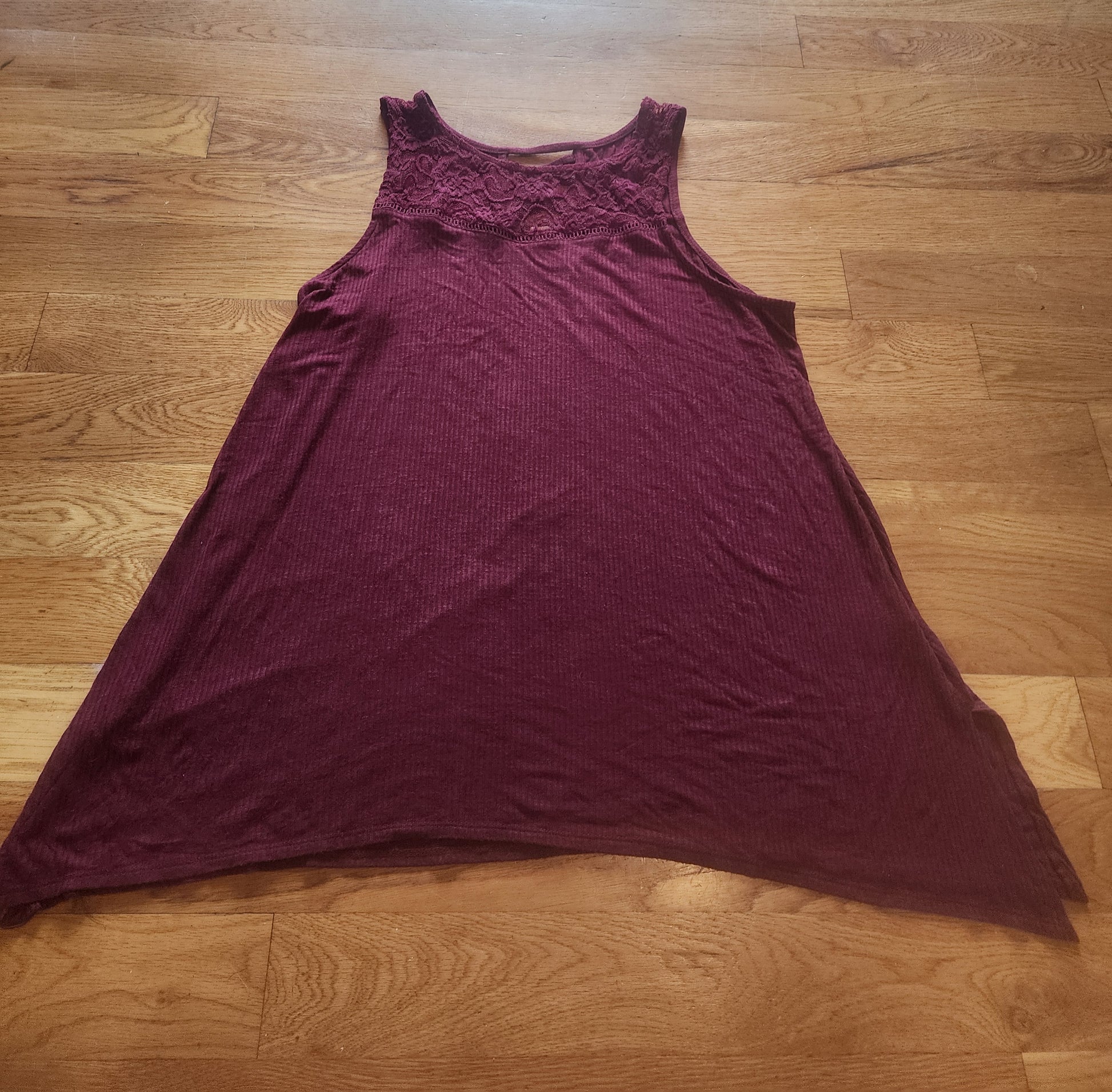 <span;>Faded Glory Women's XL 16-18 Sleeveless Stretch Tank Top with lace on top Cranberry in color or wine. It has a flowing asymmetrical bottom. This is a very long top. Measurements from pit to pit are 22" top to bottom 27" and even longer on sides. In good condition.