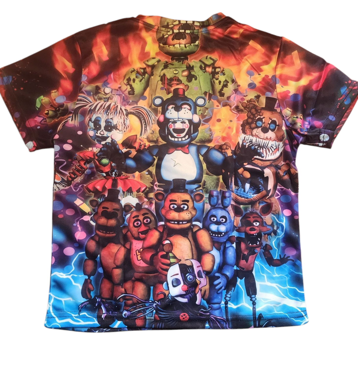 <span;>This Five Nights at Freddy's (FNAF) T-shirt in size XS is perfect for fans of the popular video game franchise. The shirt features a crew neck and short sleeves, with a colorful graphic print showcasing characters from the game. It is made from a comfortable polyester blend jersey fabric that is machine washable.
