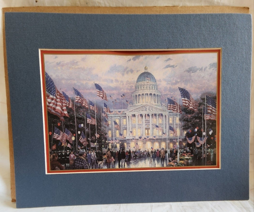 Thomas Kinkade "Flags Over the Capitol" matted print in excellent condition! This beautiful artwork comes with a certificate of authenticity and is ready to display in your home or office. Matted size is 14" x 11". Don't miss out on this opportunity to own a piece of art history!