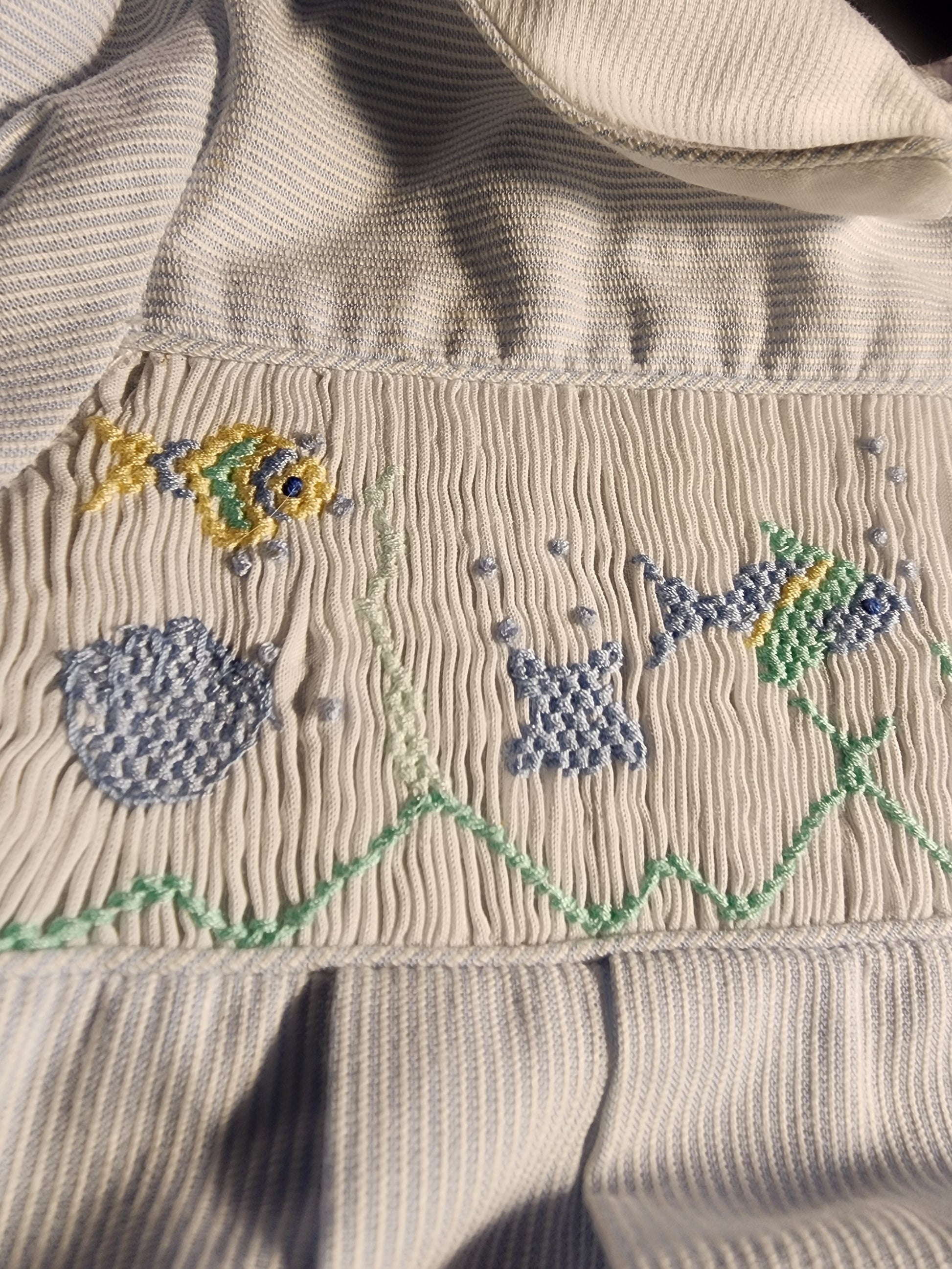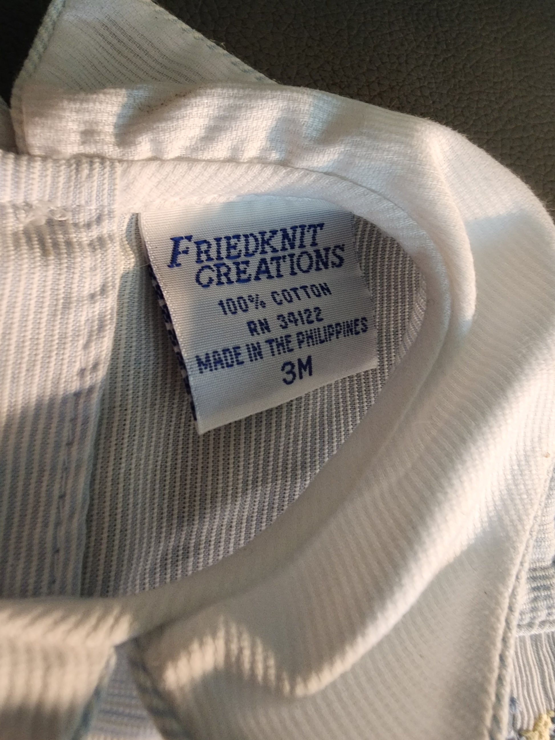 <span;>Add a touch of vintage sweetness to your baby's wardrobe with this Friedknit Creations romper. This charming 3-month piece features a classic baby blue and white striped fabric 100% cotton and exquisite hand-smocking depicting a delightful beach and ocean motif. Imagine your little one looking picture-perfect in this very good condition romper, complete with three practical snaps at the bottom and buttons in back.