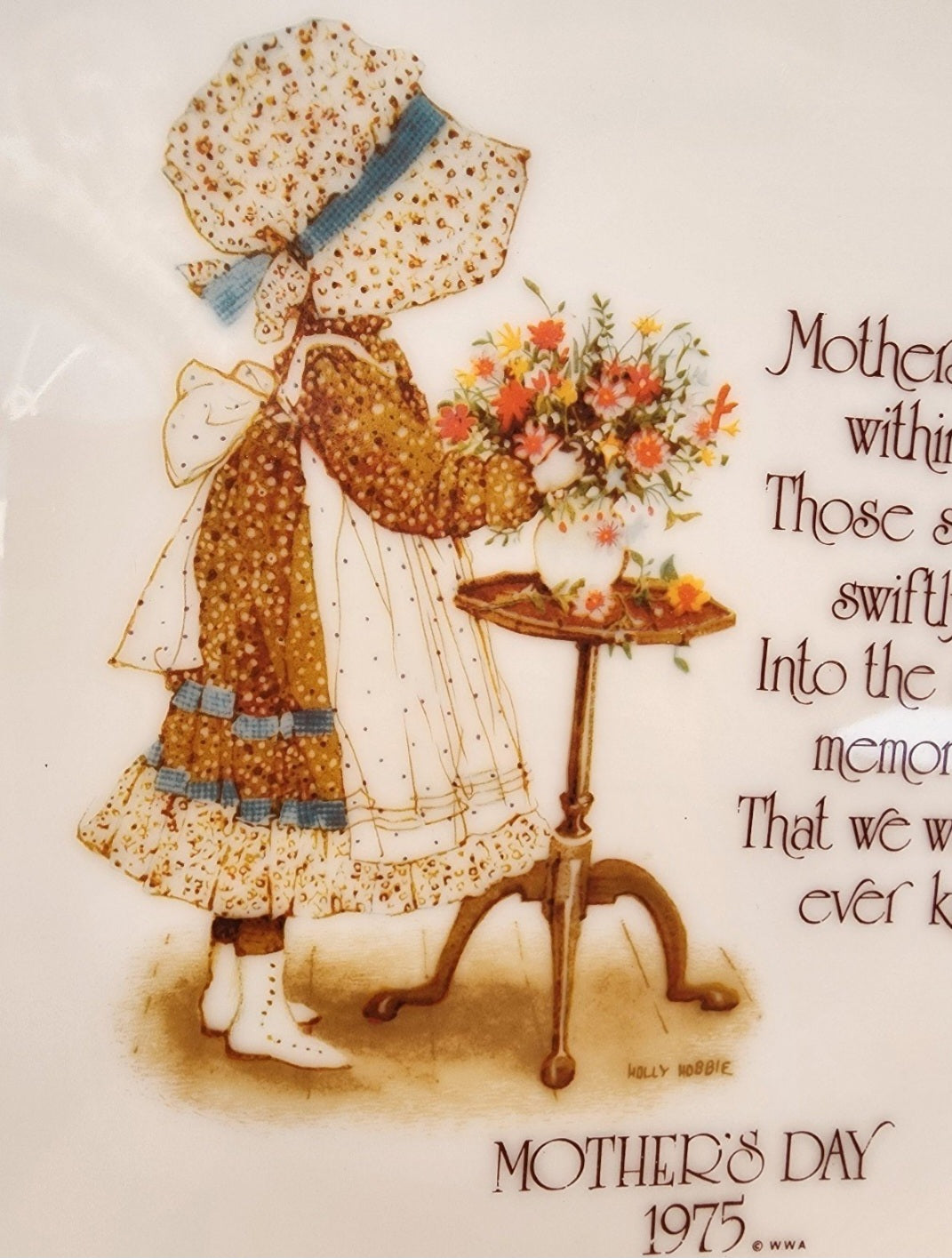 <span;>Celebrate the timeless bond of motherhood with this charming vintage Holly Hobbie Mother's Day 1975 Commemorative Porcelain Plate. This beautiful collector's item features the beloved Holly Hobbie character tending to a bouquet of flowers, accompanied by a heartfelt inscription: "Mother's plant within our hearts These seeds that swiftly grow Into the sweetest memories That we will ever know."