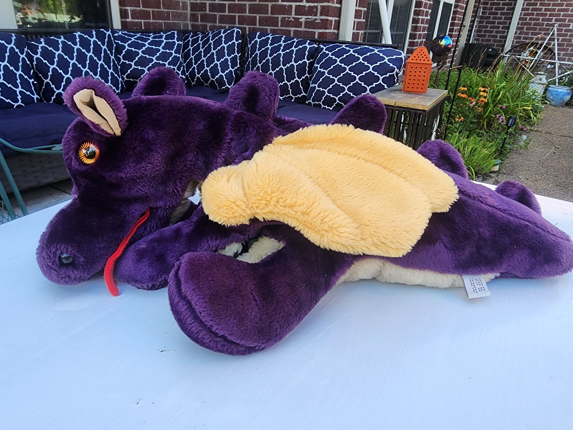 <span;>Presenting a stunning Vintage Lucy's Toys Purple and Gold Dragon Hand Puppet, an impressive approximately 25 inches long from snout to tail (when laid flat). This captivating puppet features a vibrant purple plush body, striking gold wings, and expressive amber-gold eyes, truly bringing this fantastical beast to life.