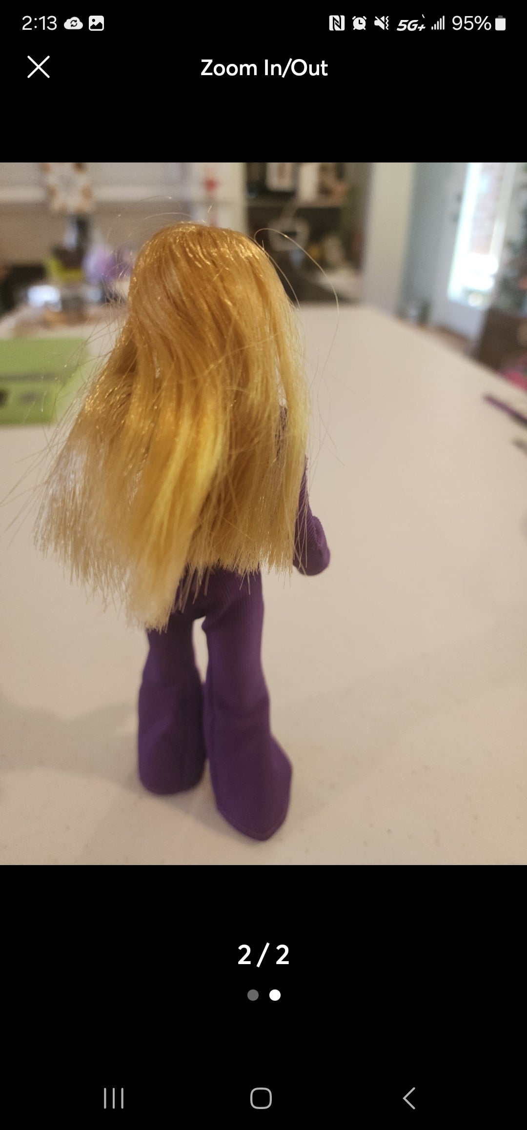 This listing features a vintage Mego action figure, identified as 'Dinah Mite,' produced in 1972. The figure measures approximately 7 1/2 inches in height and exhibits jointed articulation. It is presented with a purple, full-body garment and a white belt. The figure possesses blonde, synthetic hair and appears to have blue-colored irises."The doll is on good condition.