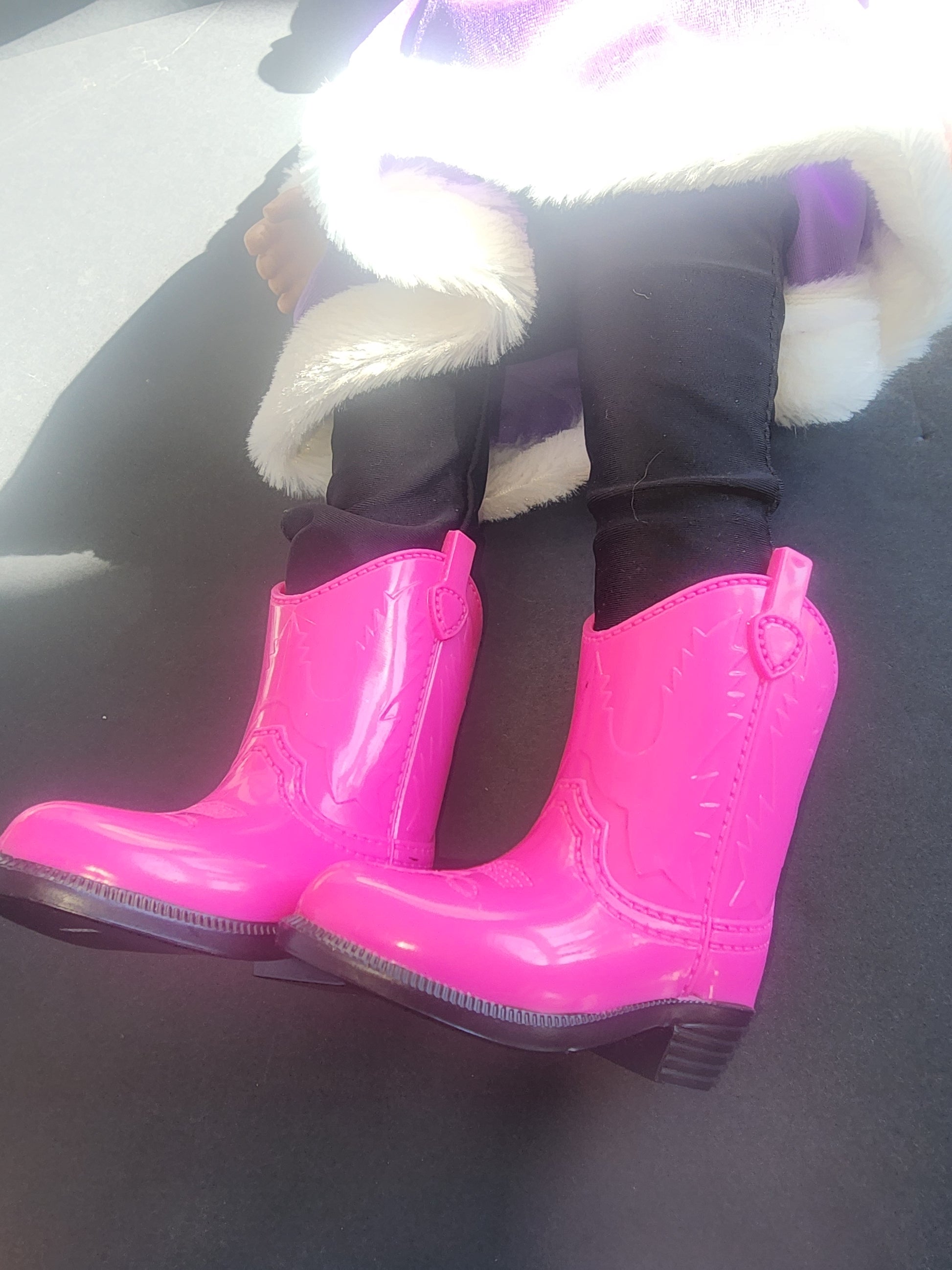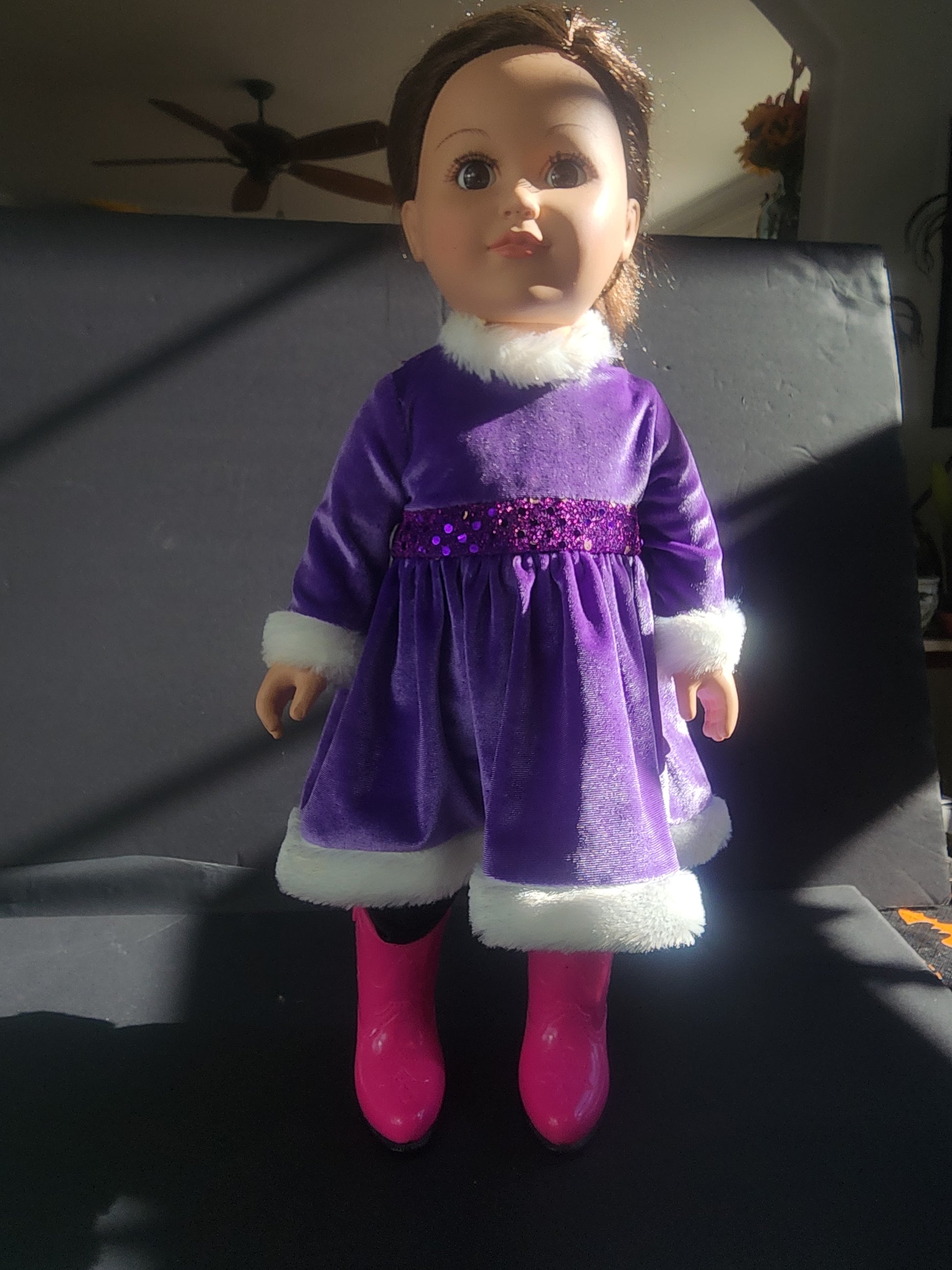 MY LIFE AS 2013 Cititoy 18” Doll Brown Hair Brown Eyes open close Poseable. In good preowned condition. She is ready to go to her new home with her purple velour dress with white faux fur Trimmed dress, black leggings and pink cowboy boots. Her dress is missing a couple of sequins.