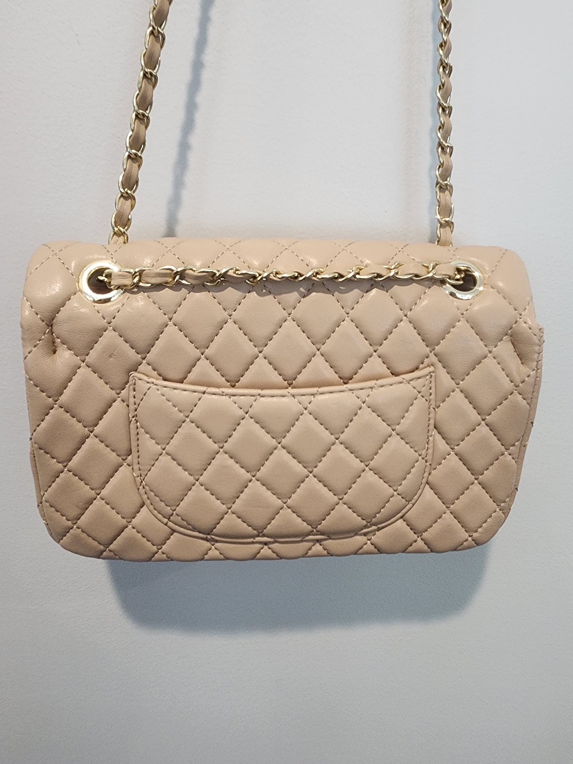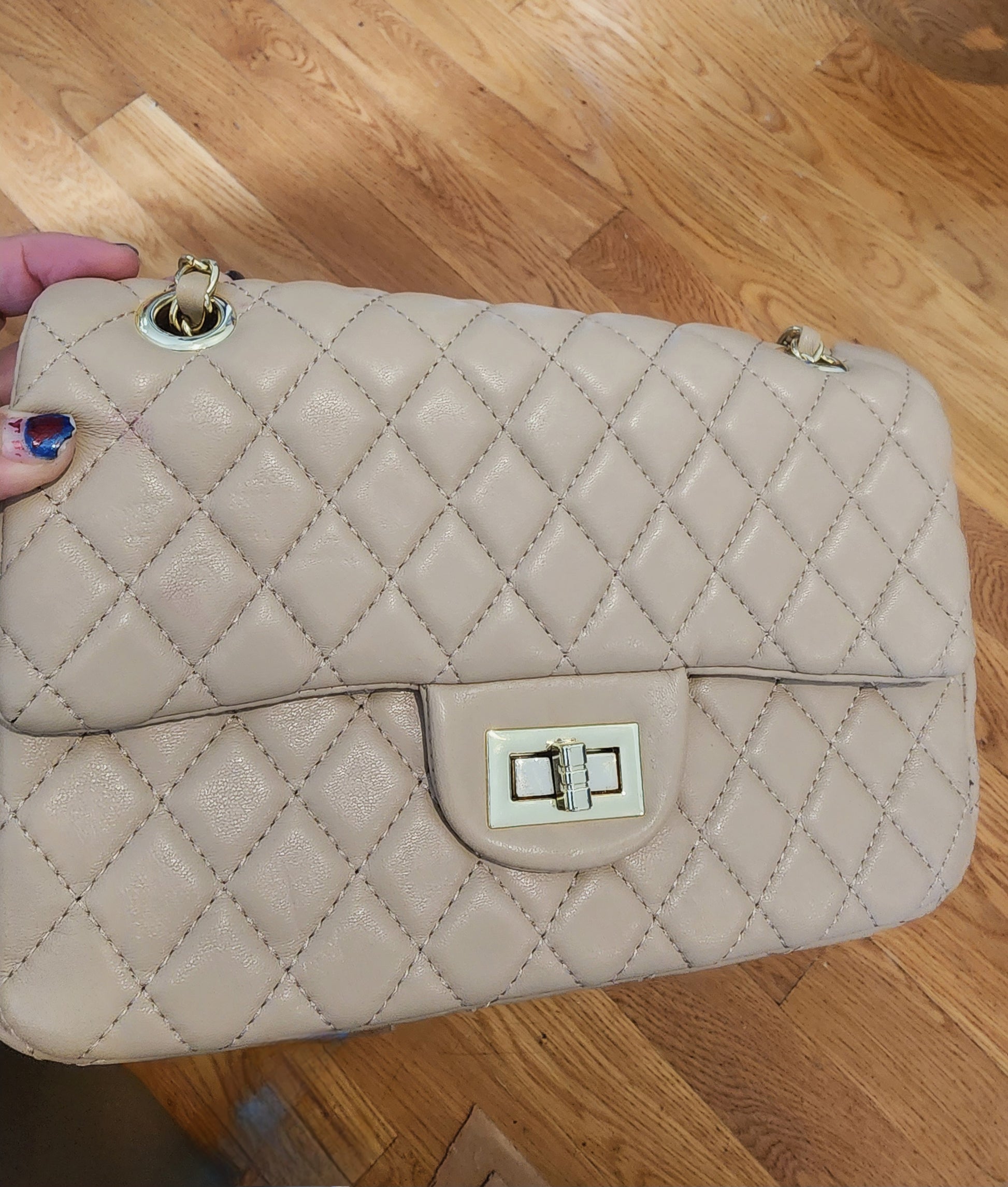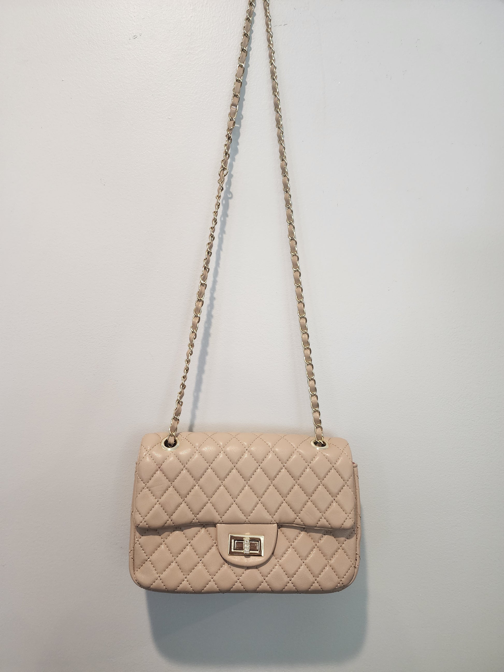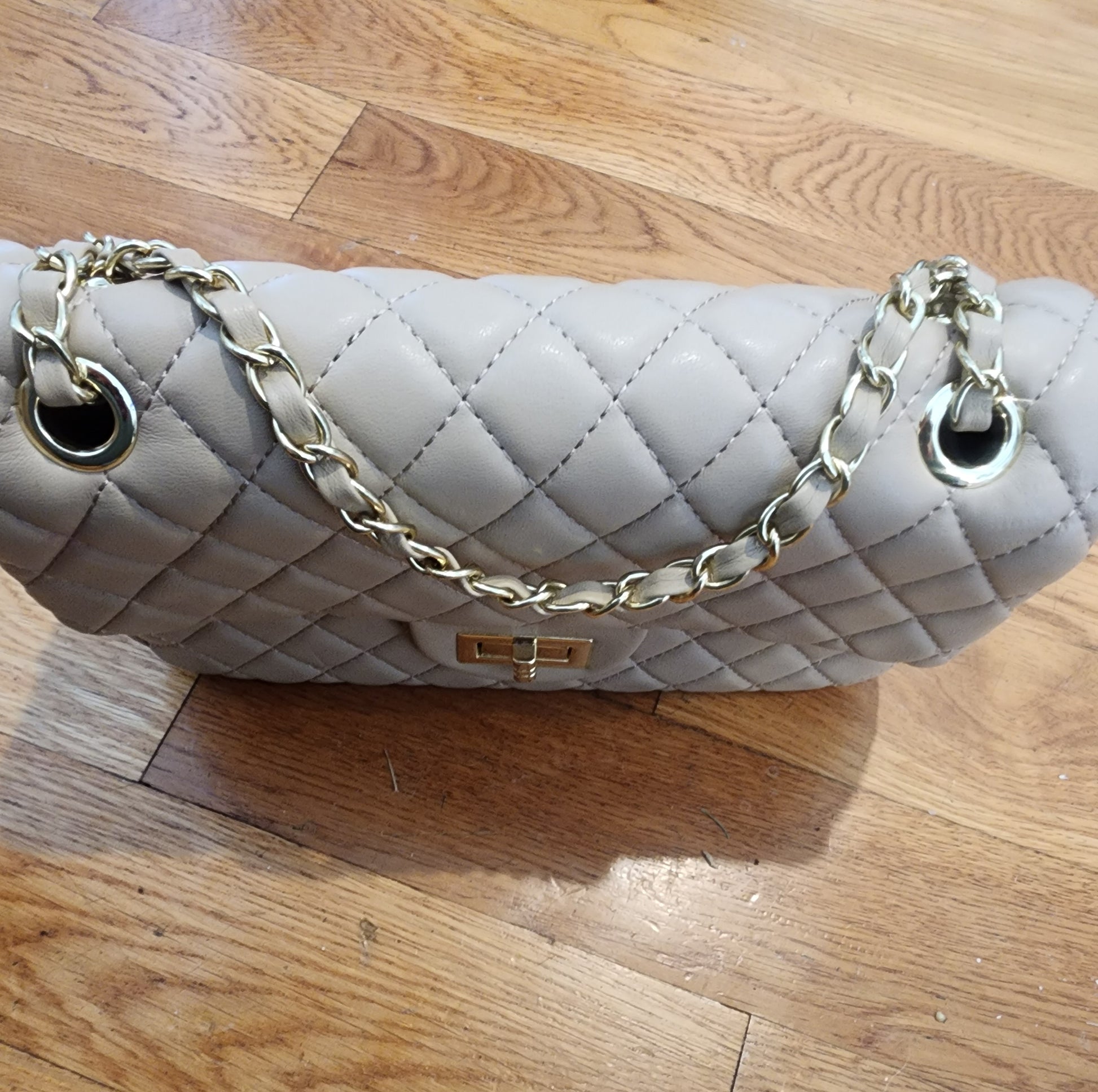 <span;>Quilted Leather beige purse with gold tone accents and chain. Measurements 10" longʻ x 7" tall x 2.75" wide
