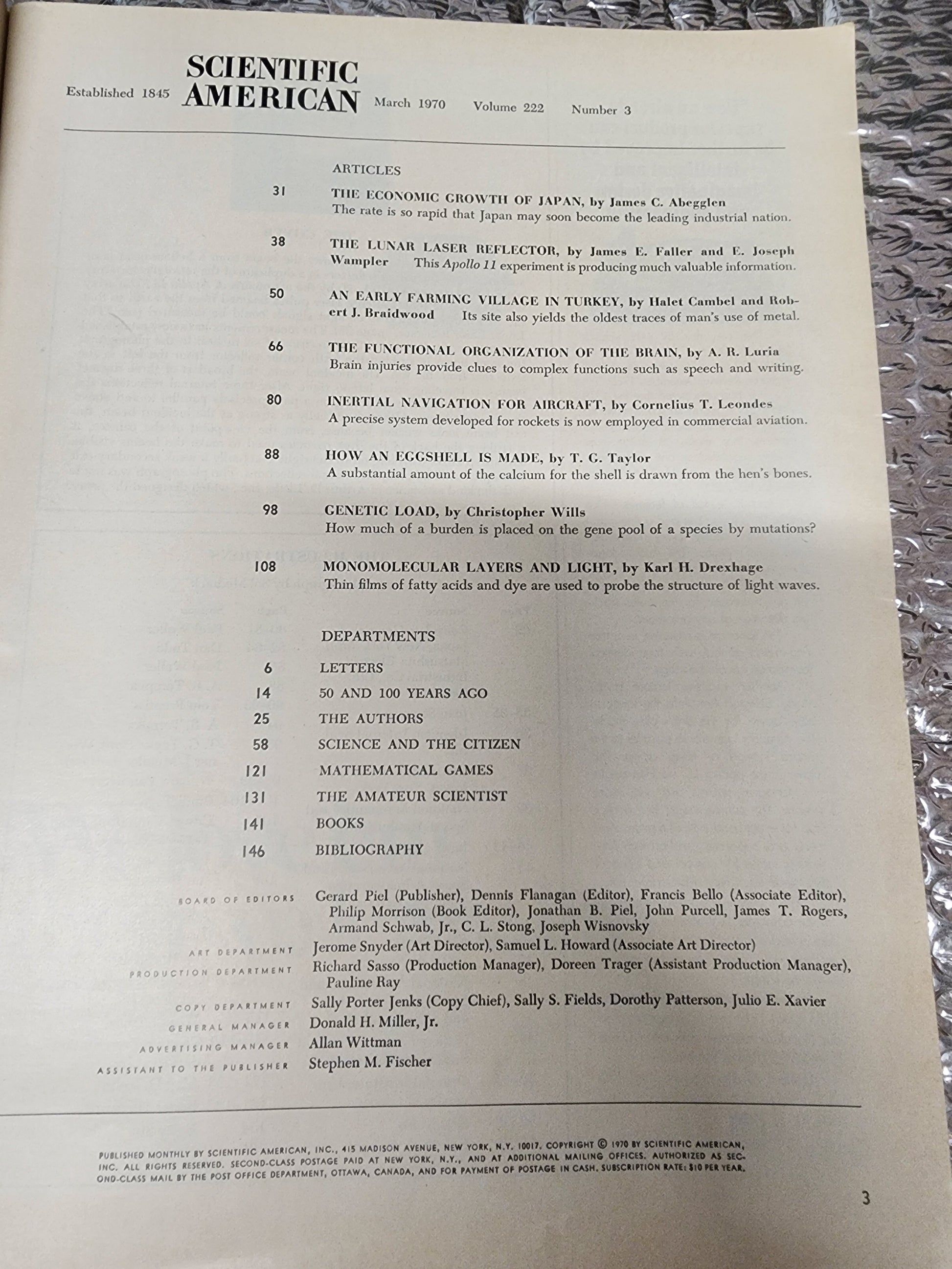 Scientific American Magazine 1970 March Lunar Laser Japan Economy Growth Brain