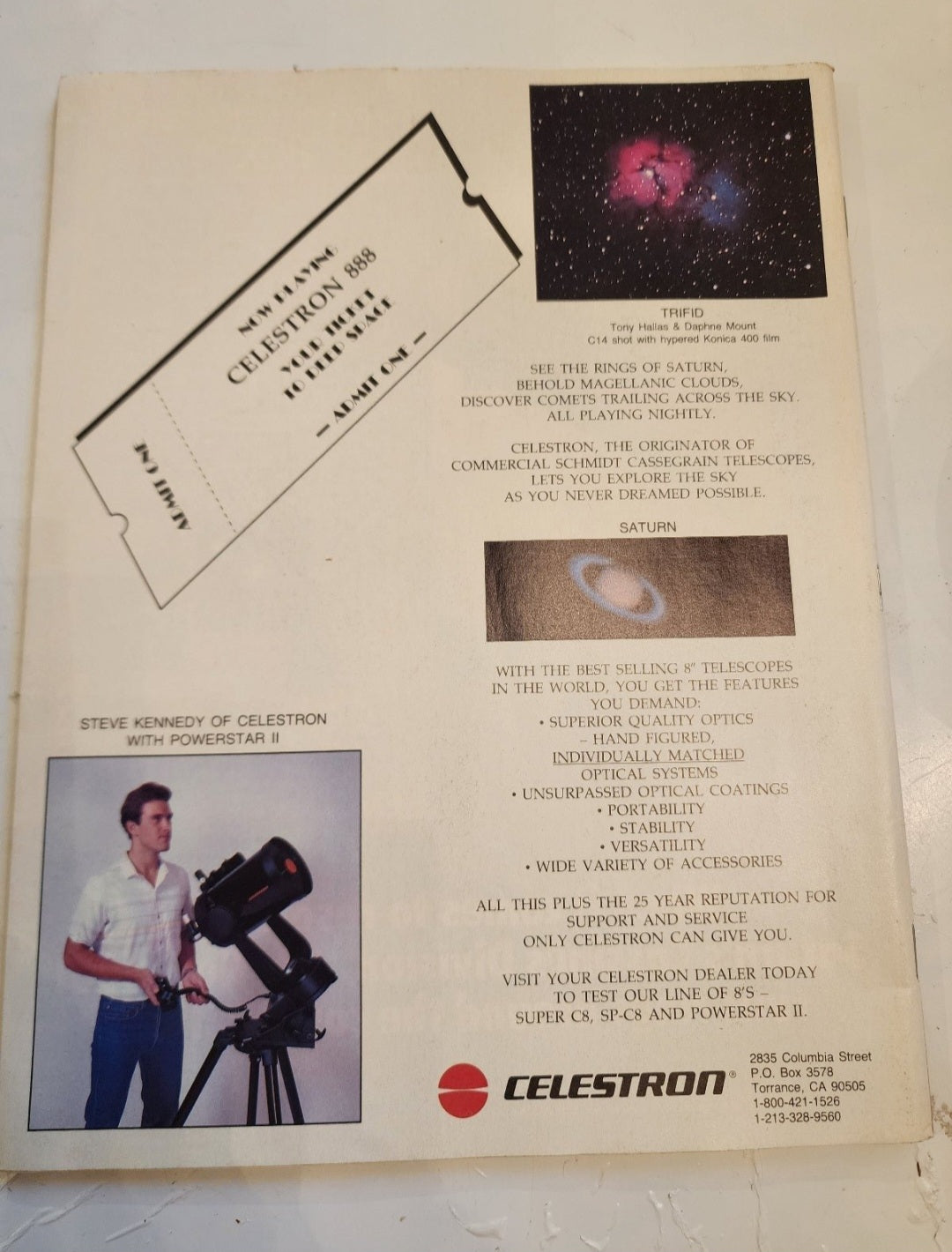 > Own a piece of astronomy history! This December 1987 issue of Sky & Telescope features articles on elementary particles, the Kvant X-ray observatory, telescope innovations, and more. Good condition, some minor wear consistent with age. Perfect for collectors and astronomy enthusiasts.
