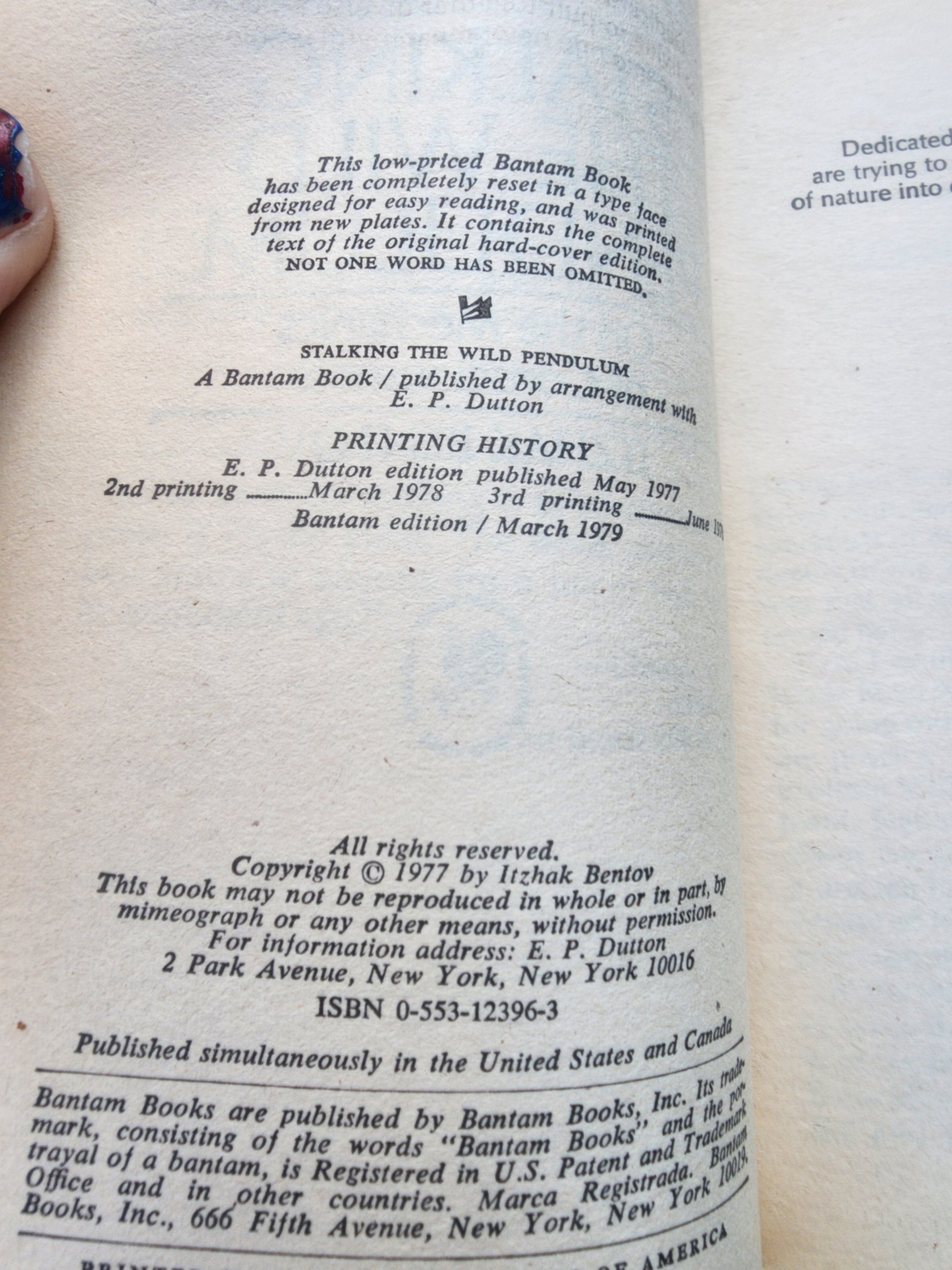 Stalking the Wild Pendulum: On the Mechanics of Consciouness (Paperback) 1977, in good condition. - In his exciting and original view of the universe, Itzhak Bentov has provided a new perspective on human consciousness and its limitless possibilities. Widely known and loved for his delightful humor and imagination, Bentov explains the familiar world of phenomena with perceptions that are as lucid as they are thrilling. He gives us a provocative picture of ourselves in an expanded, conscious, holistic universe.