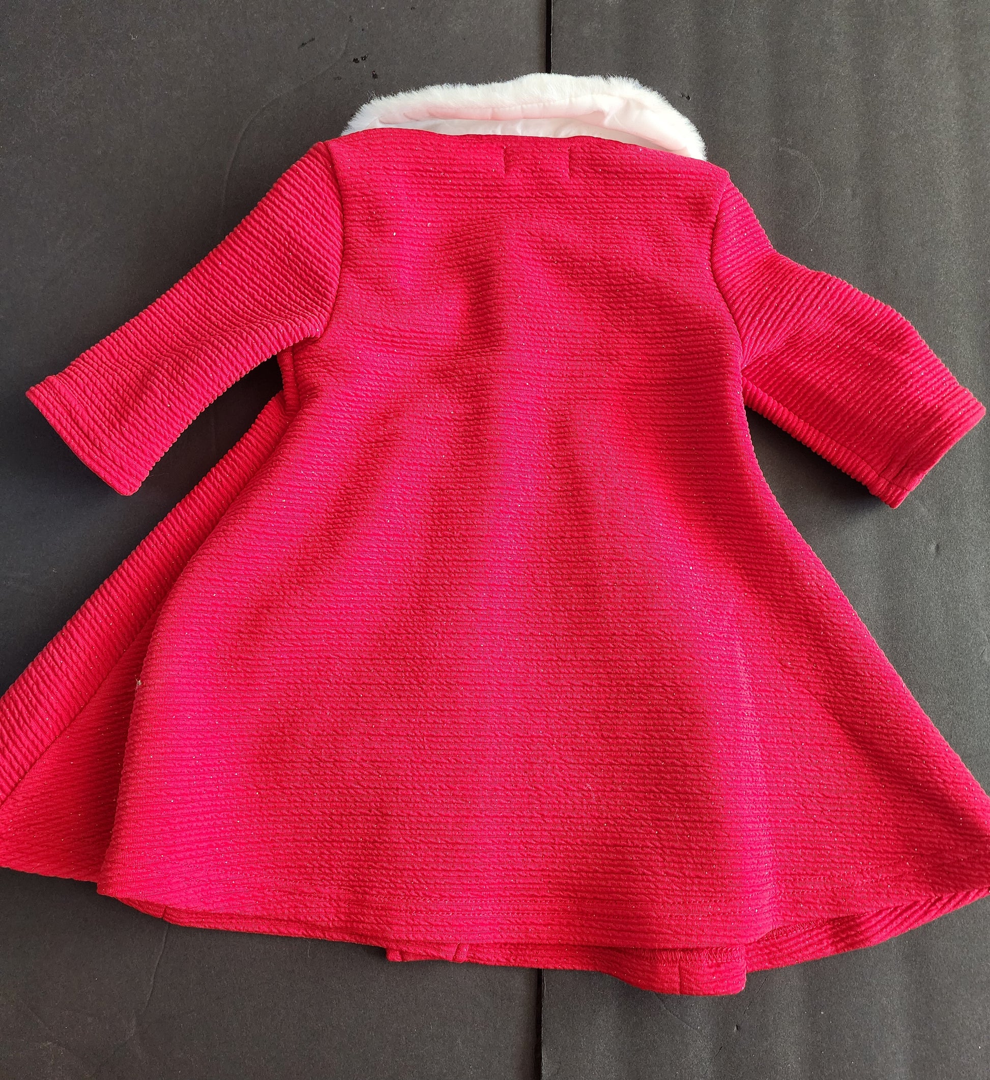 This is an adorable, festive infant girl's coat, styled like a dress, perfect for the holiday season, Christmas, or any special winter occasion. The vibrant red color, faux fur collar, and sparkly accents make this a true showstopper! It's in very good condition