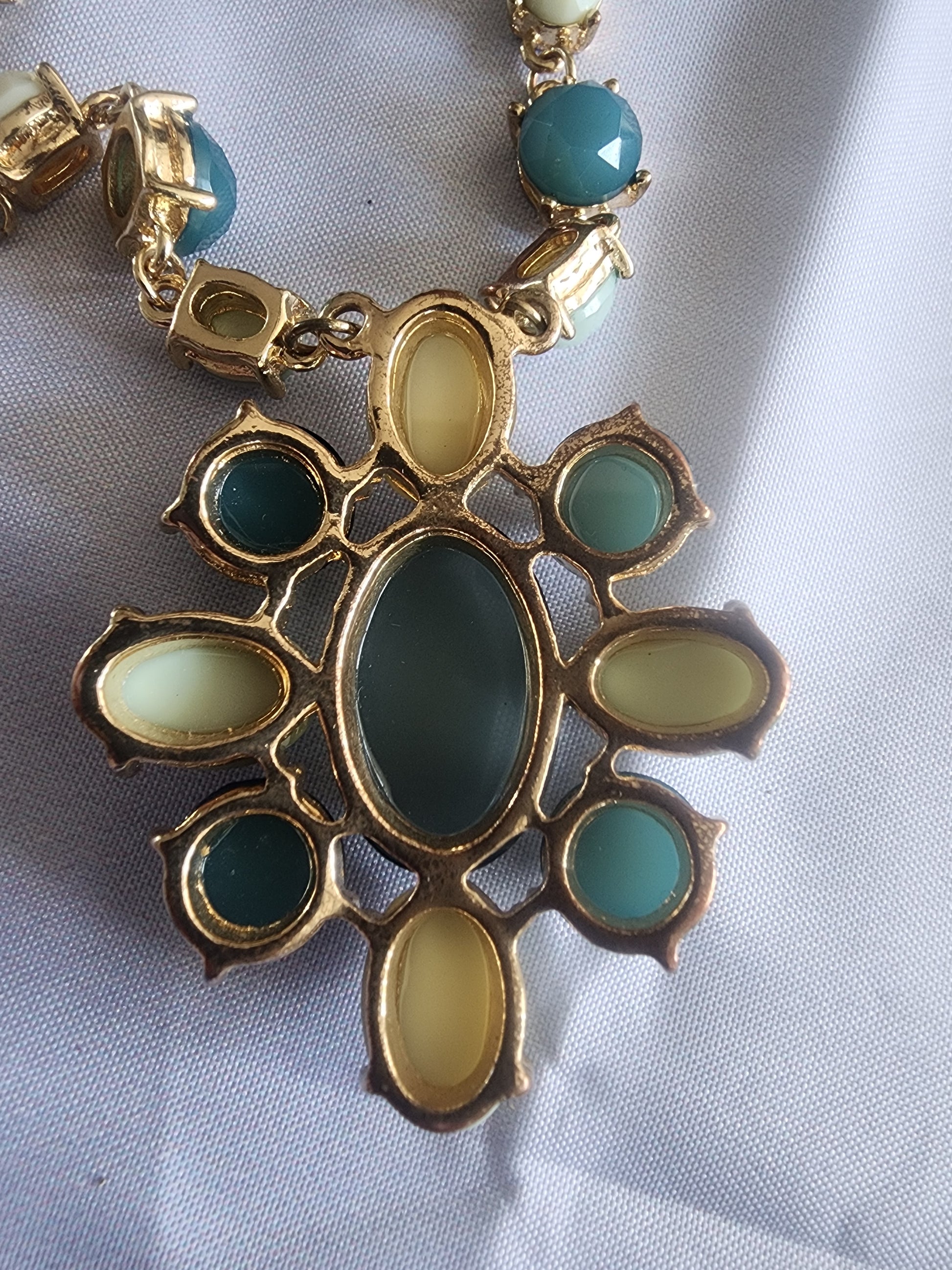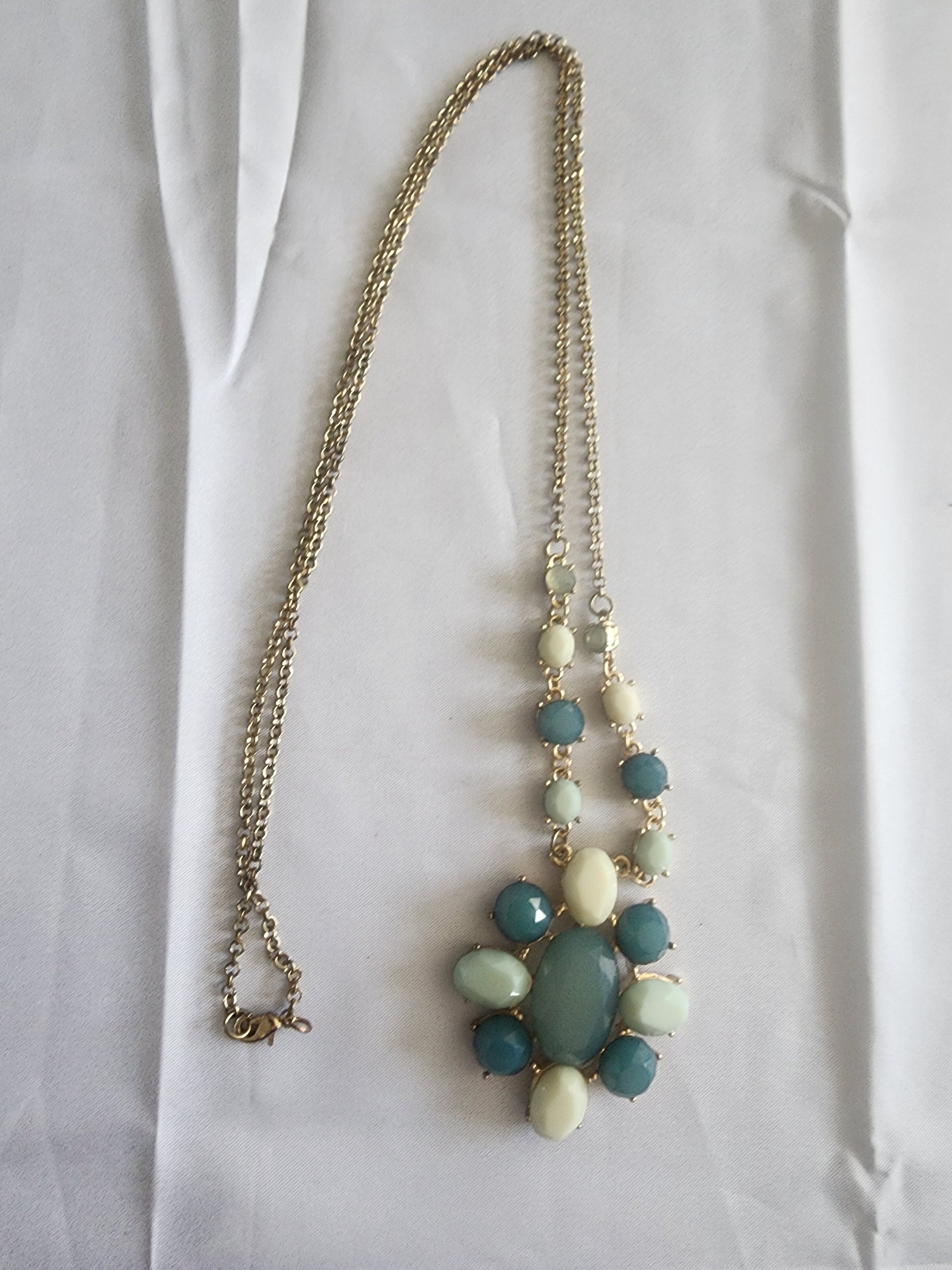 <span;>This vintage necklace features a stunning cluster of teal and cream cabochon stones, reminiscent of a blooming flower. The soft, muted tones and delicate gold-toned chain create a timeless piece that adds a touch of elegance to any outfit. This is a long necklace and hangs to 20.50" , so it's aprox 41" long