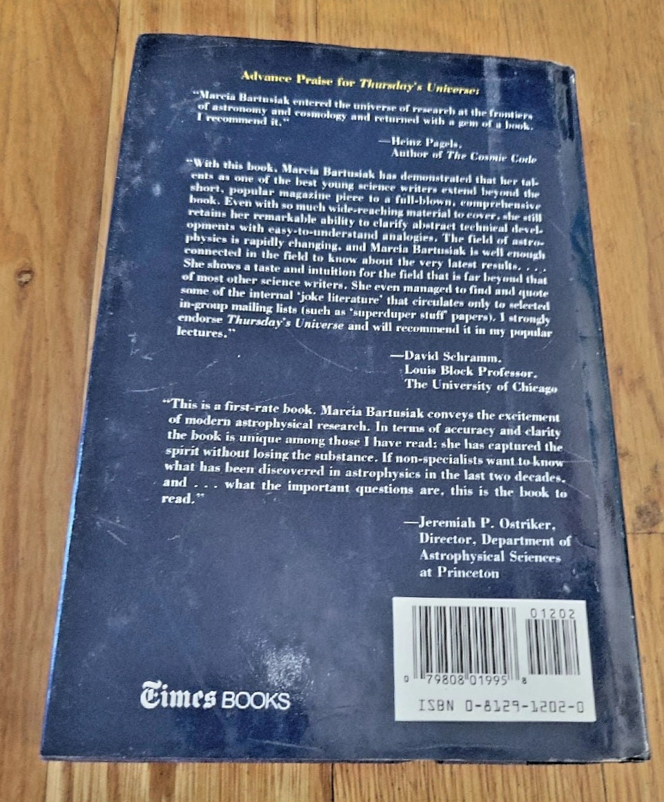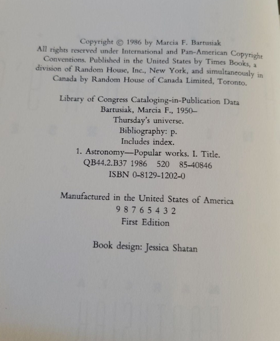 Explore the cosmos with "Thursday's Universe" by Marcia Bartusiak, an award-winning science writer recognized by the American Institute of Physics. This hardcover edition offers a fascinating journey into the origin, nature, and destiny of the universe. Please note a small tear on the cover.