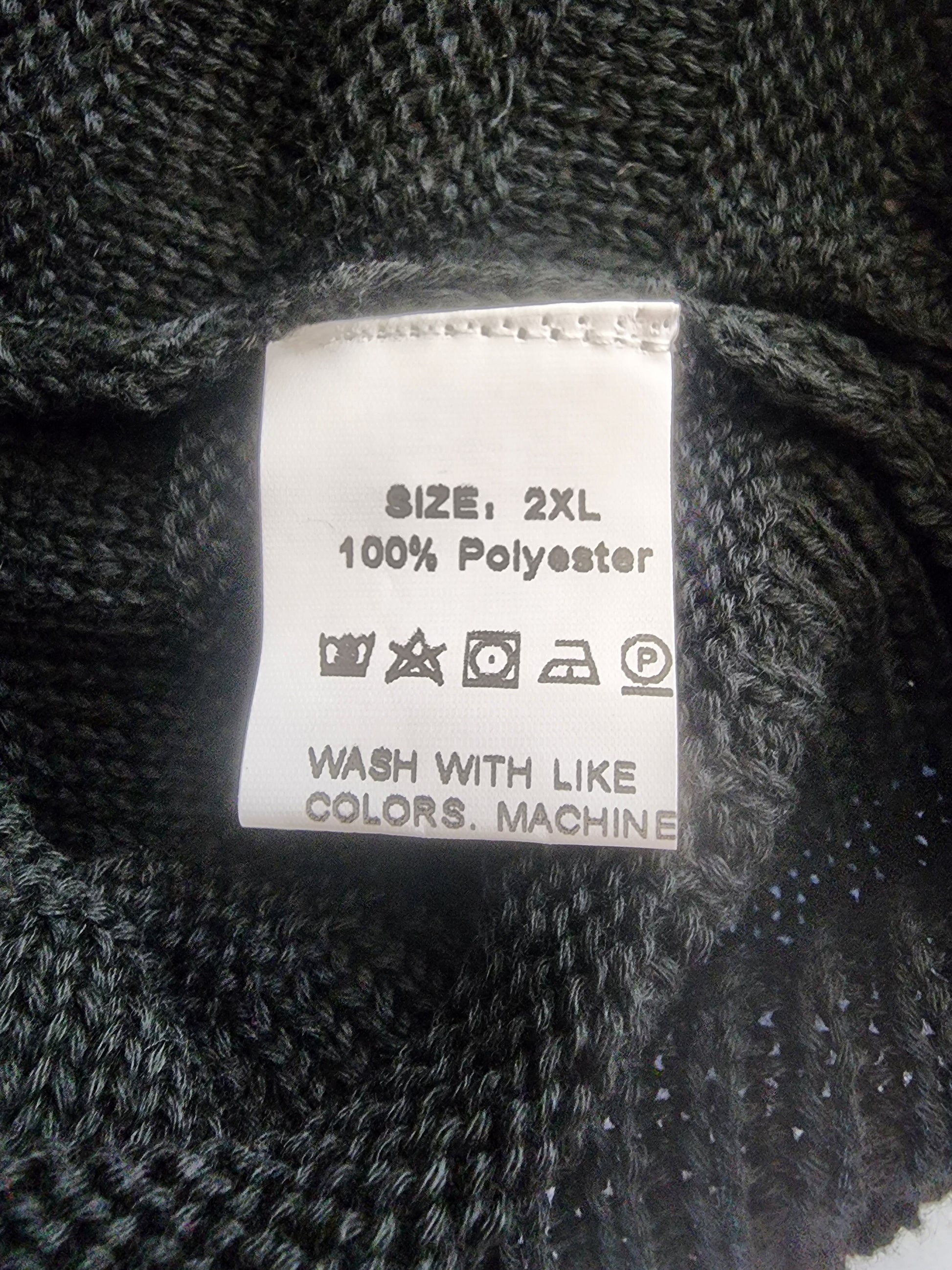 While the main brand tag has been removed, the care tag indicates the sweater is a size 2XL and made from 100% polyester, which means it's durable and easy to care for.