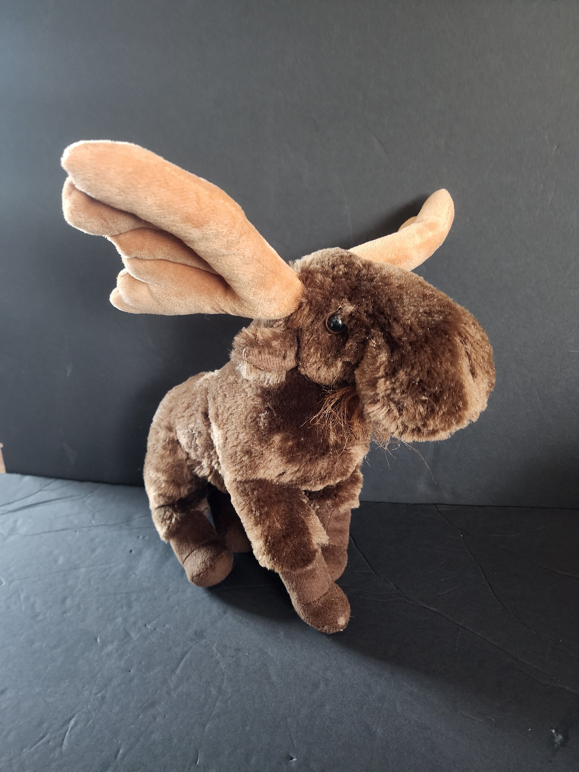 Beautifully maintained Unipak Moose plush seeking a new home. This 12-inch stuffed animal features a rich, dark brown coat and soft, oversized tan antlers. It includes realistic details like a textured beard and a sturdy, weighted feel thanks to the internal PVC pellet fill.