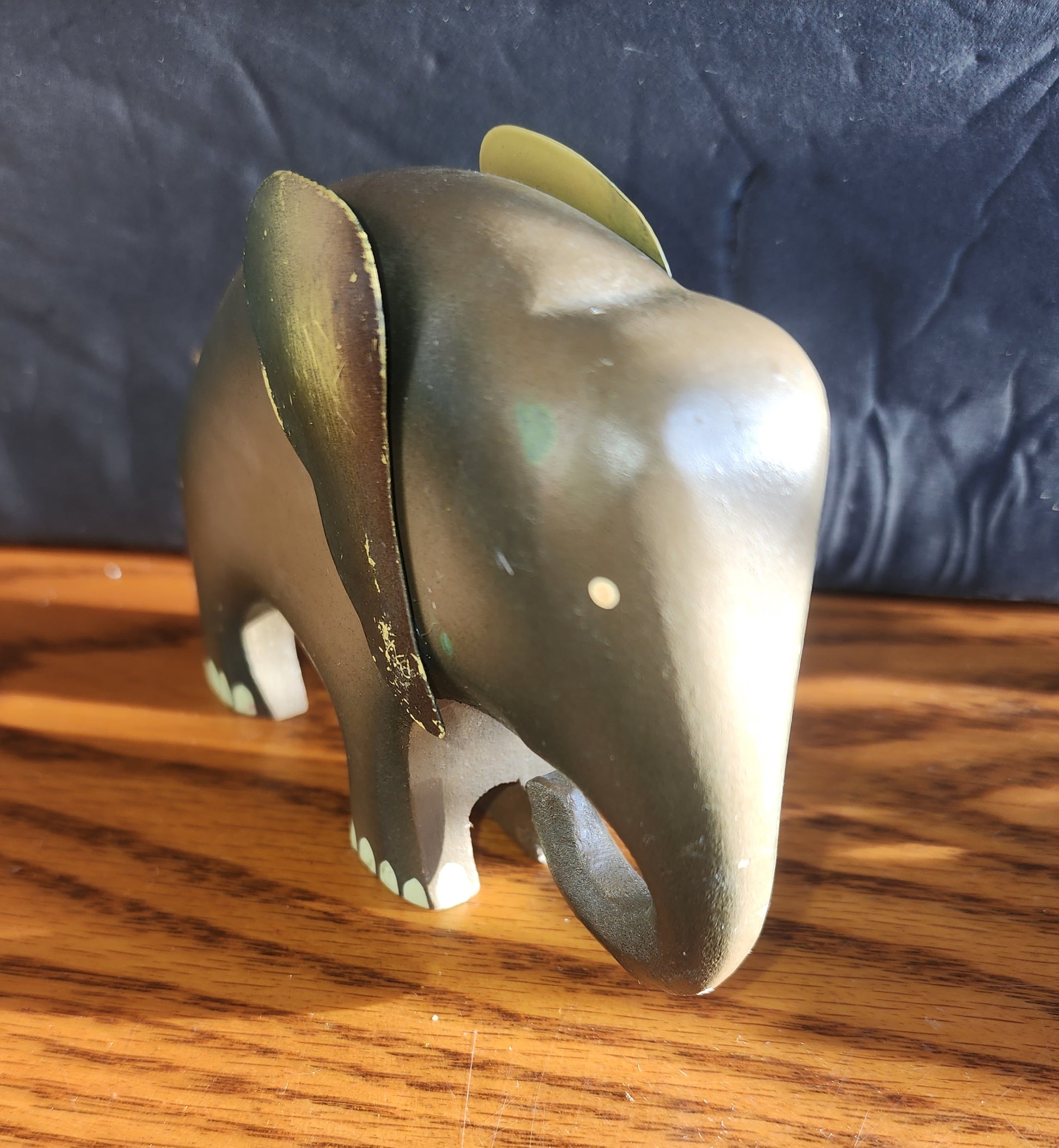 Vintage Wooden Elephant Figurine, Hand Painted, Metal Ears 5×3×2" Gray Brown