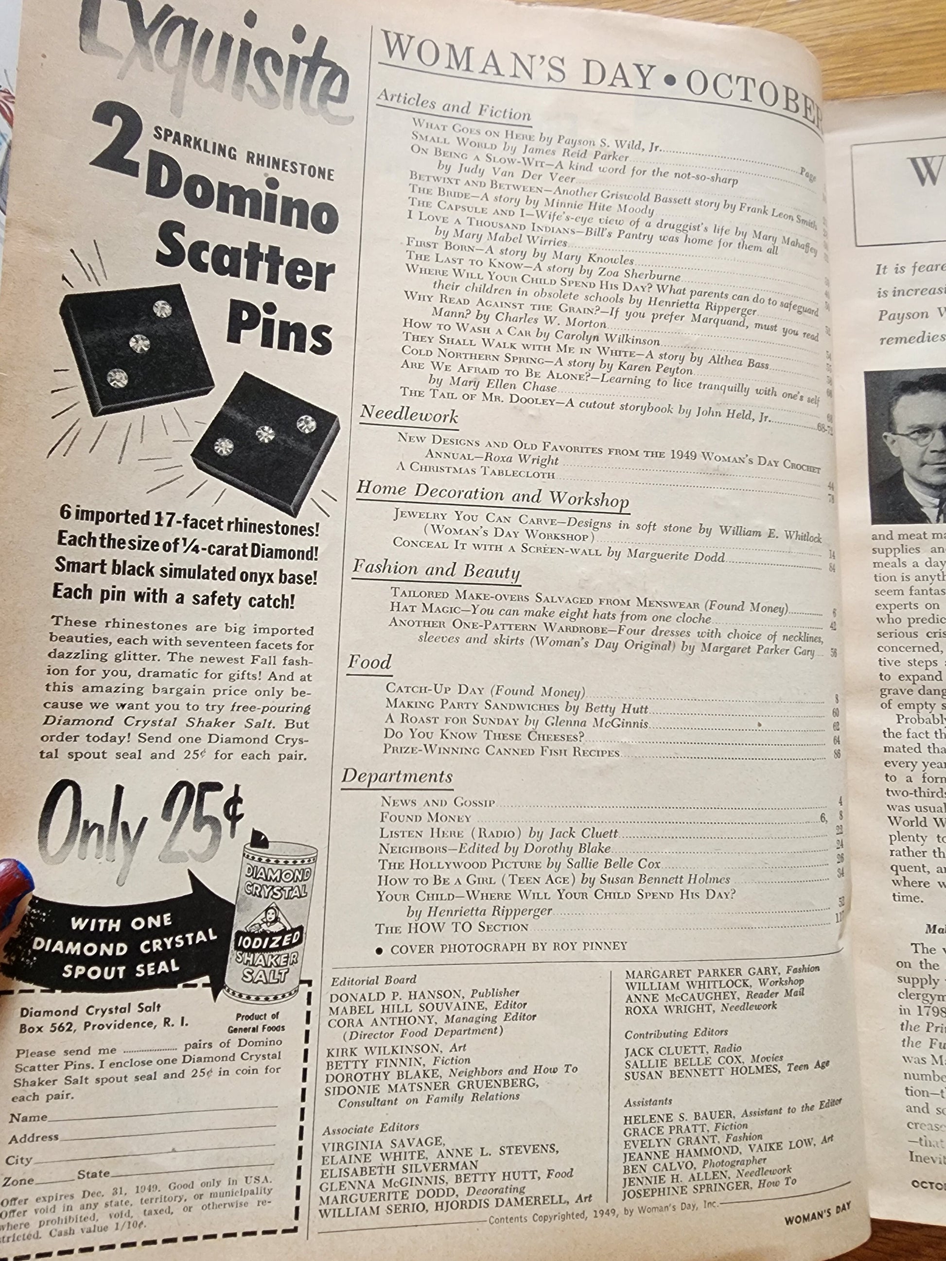 Step back in time with this charming October 1949 issue of Woman's Day magazine. This vintage gem is in good condition considering its age, showcasing "Tailored Make-Overs" features and a wealth of fascinating original advertisements. Perfect for collectors of ephemera, vintage advertising, or those interested in mid-century Americana.