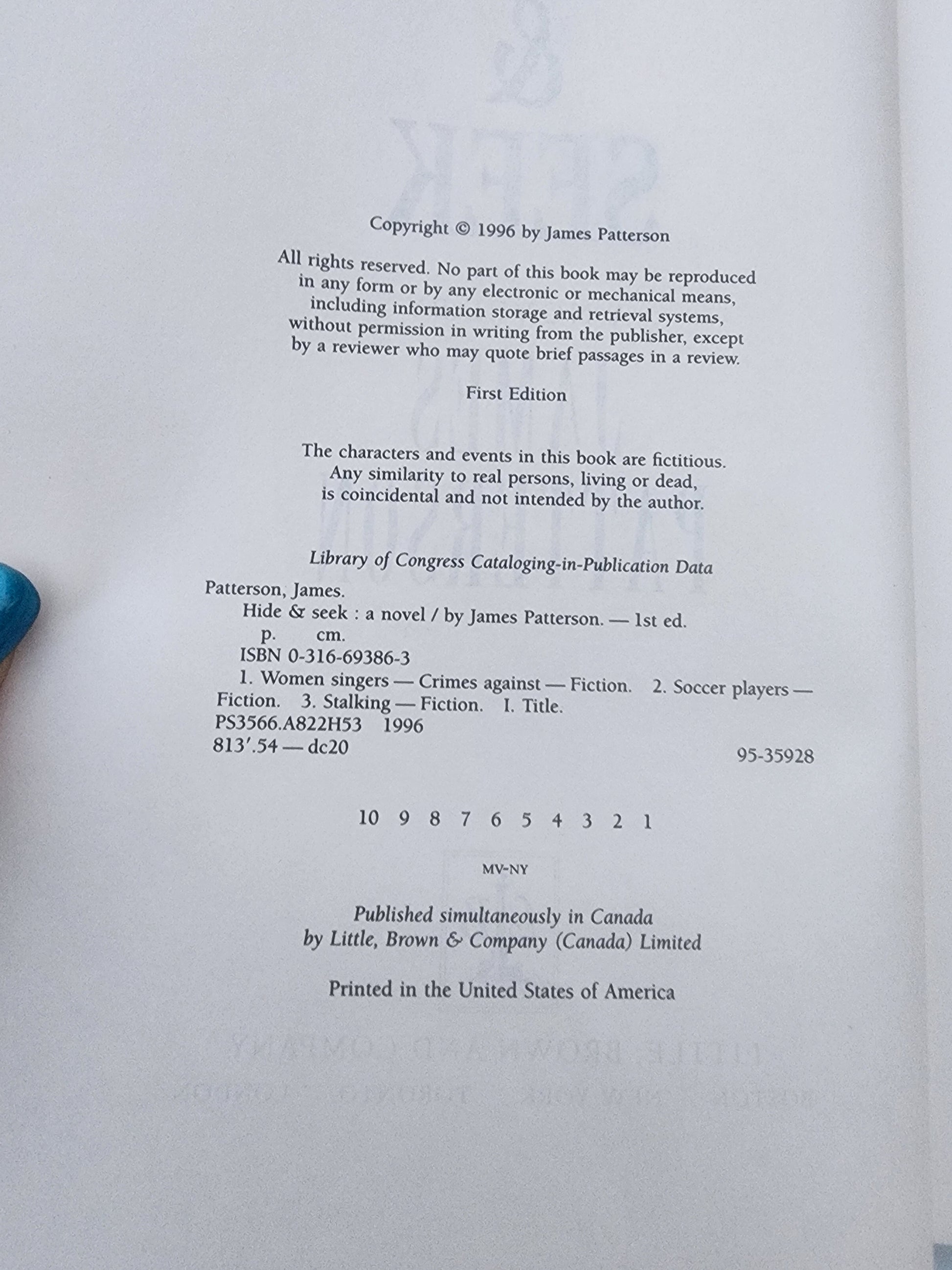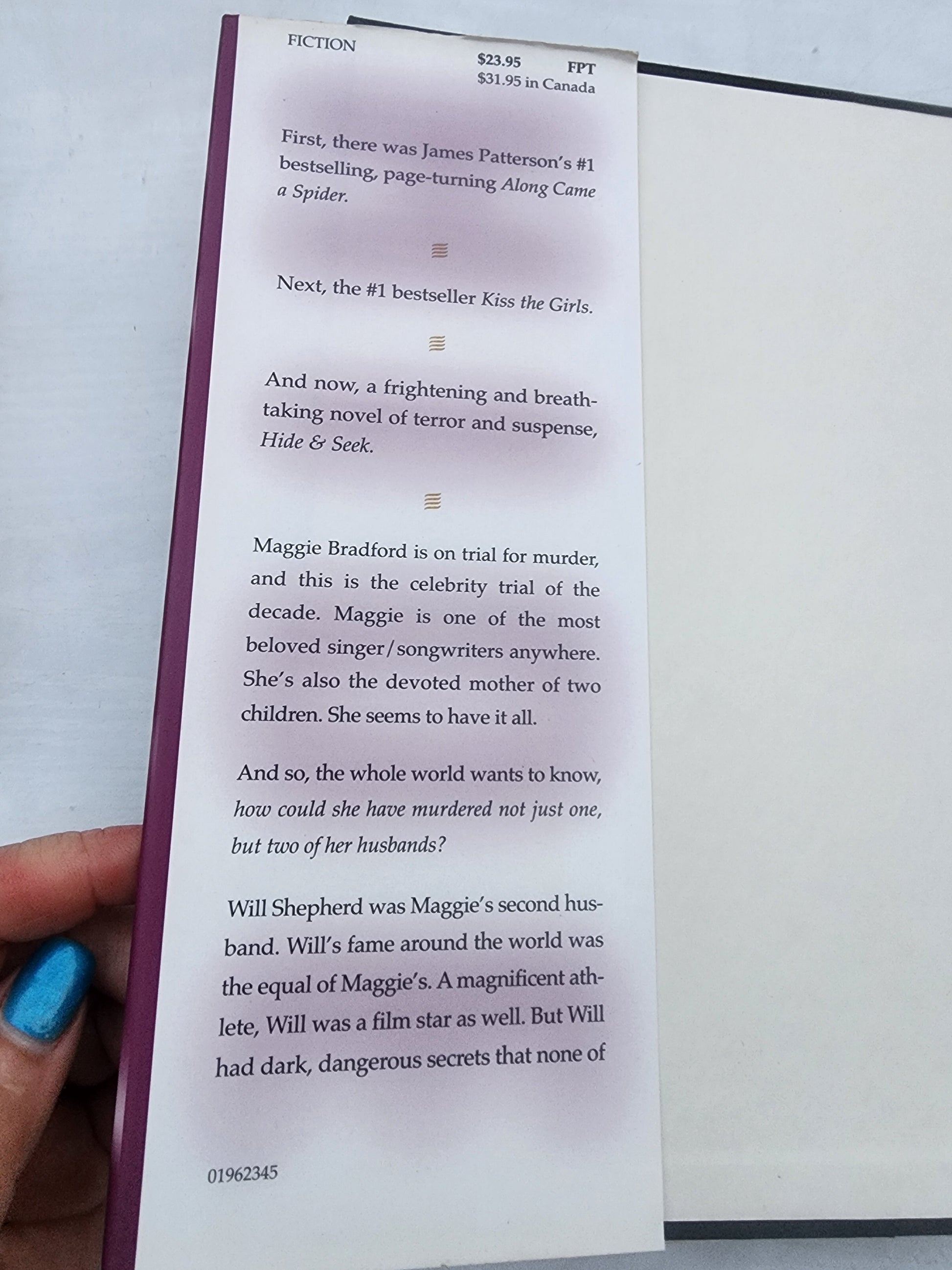 <span;>Dive into the suspense of James Patterson's "Hide & Seek," a 1996 hardcover edition in good condition with minimal wear. Successful singer/songwriter Maggie Bradford finds herself on trial for the murder of her second husband, with the shadow of her past fueling public speculation. Was it self-defense again, or is there a darker truth? A gripping read from the bestselling author of "Kiss the Girls" and "Along Came a Spider."