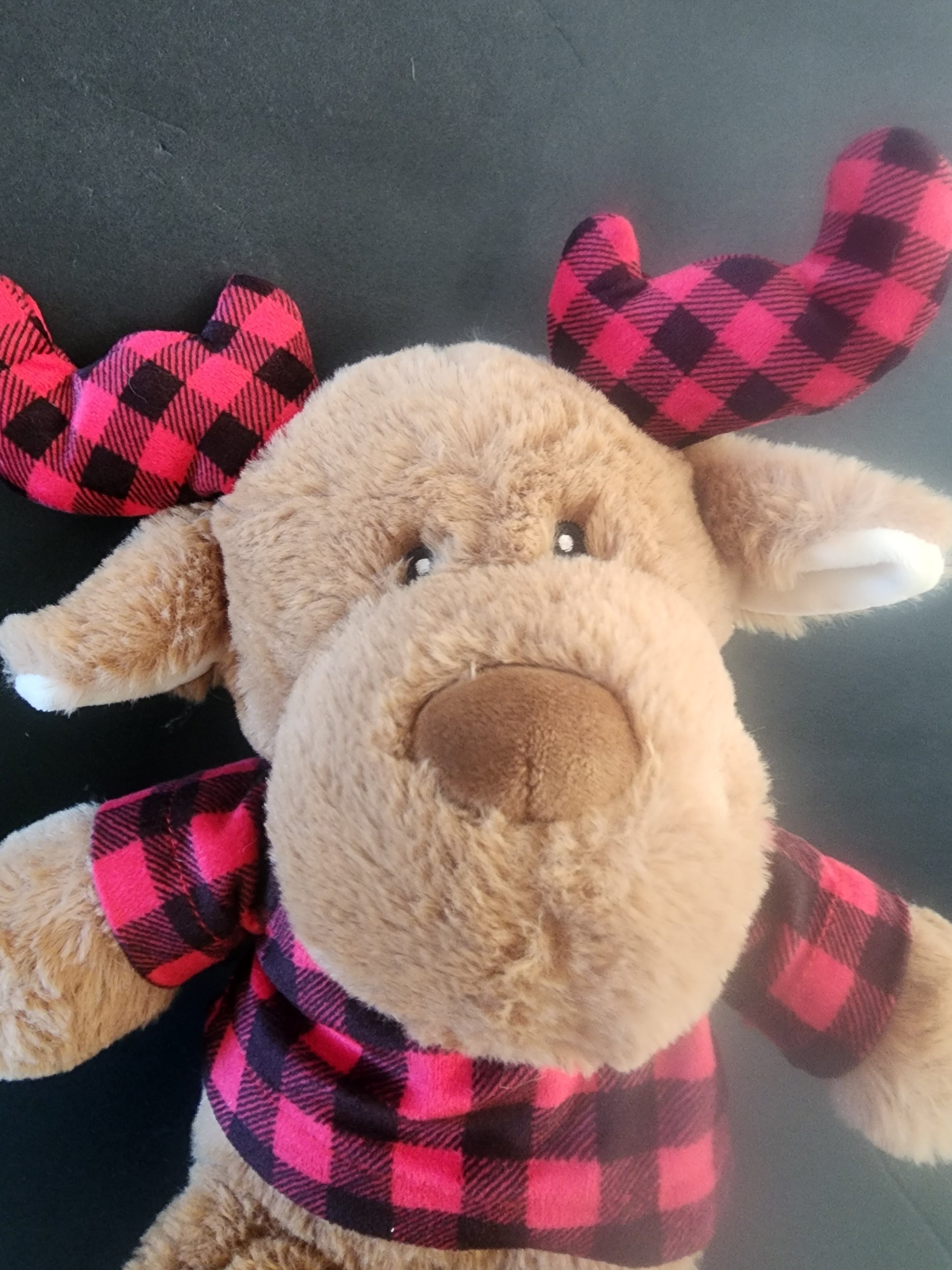 Plush Cuddle Stuffed Animal Brown Moose Rattles With Red Plaid Scarf and Ears