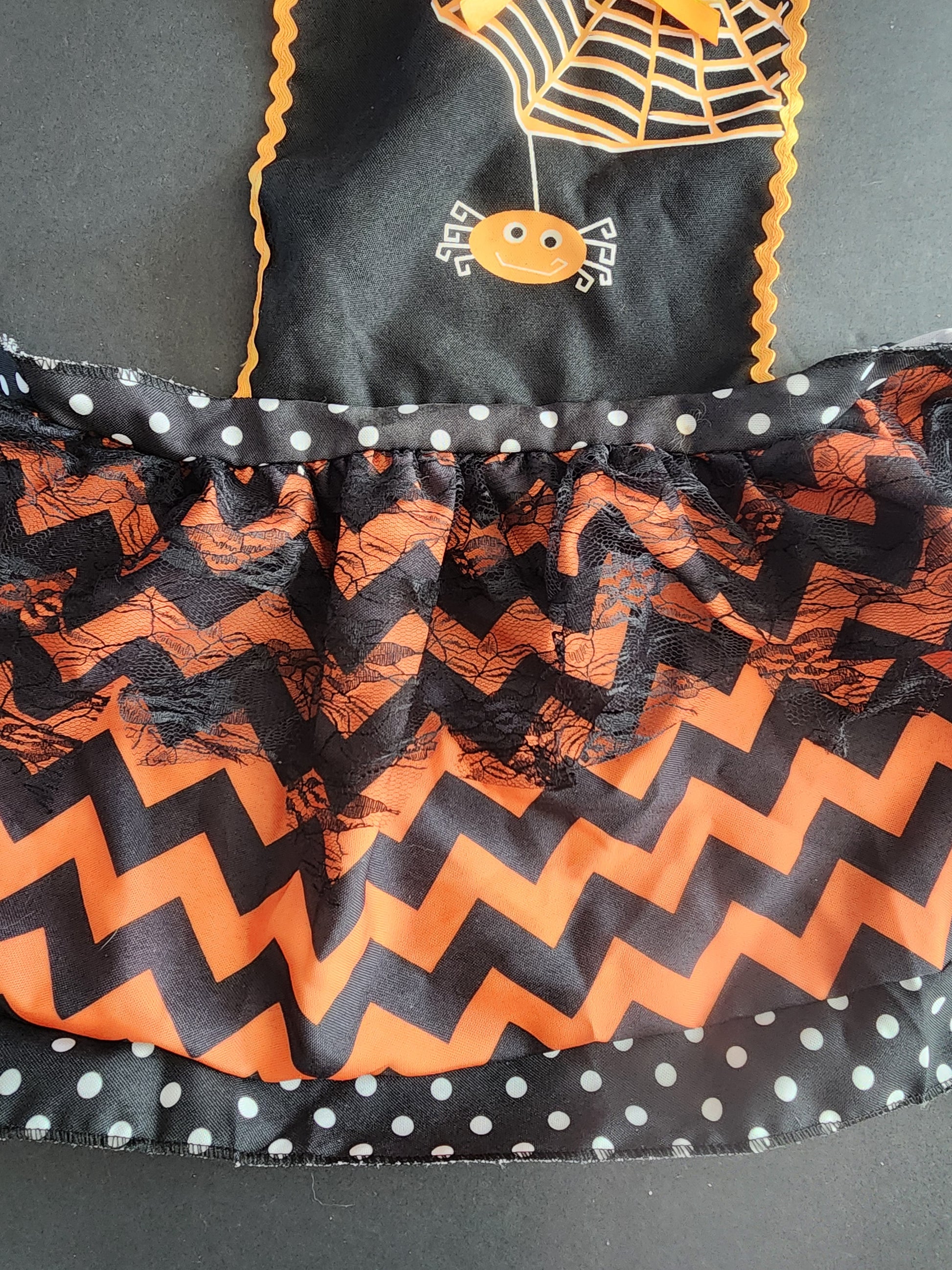 Halloween Polka Dot Spider Web Apron Black Orange in good condition. Fits most up to child size 4-8