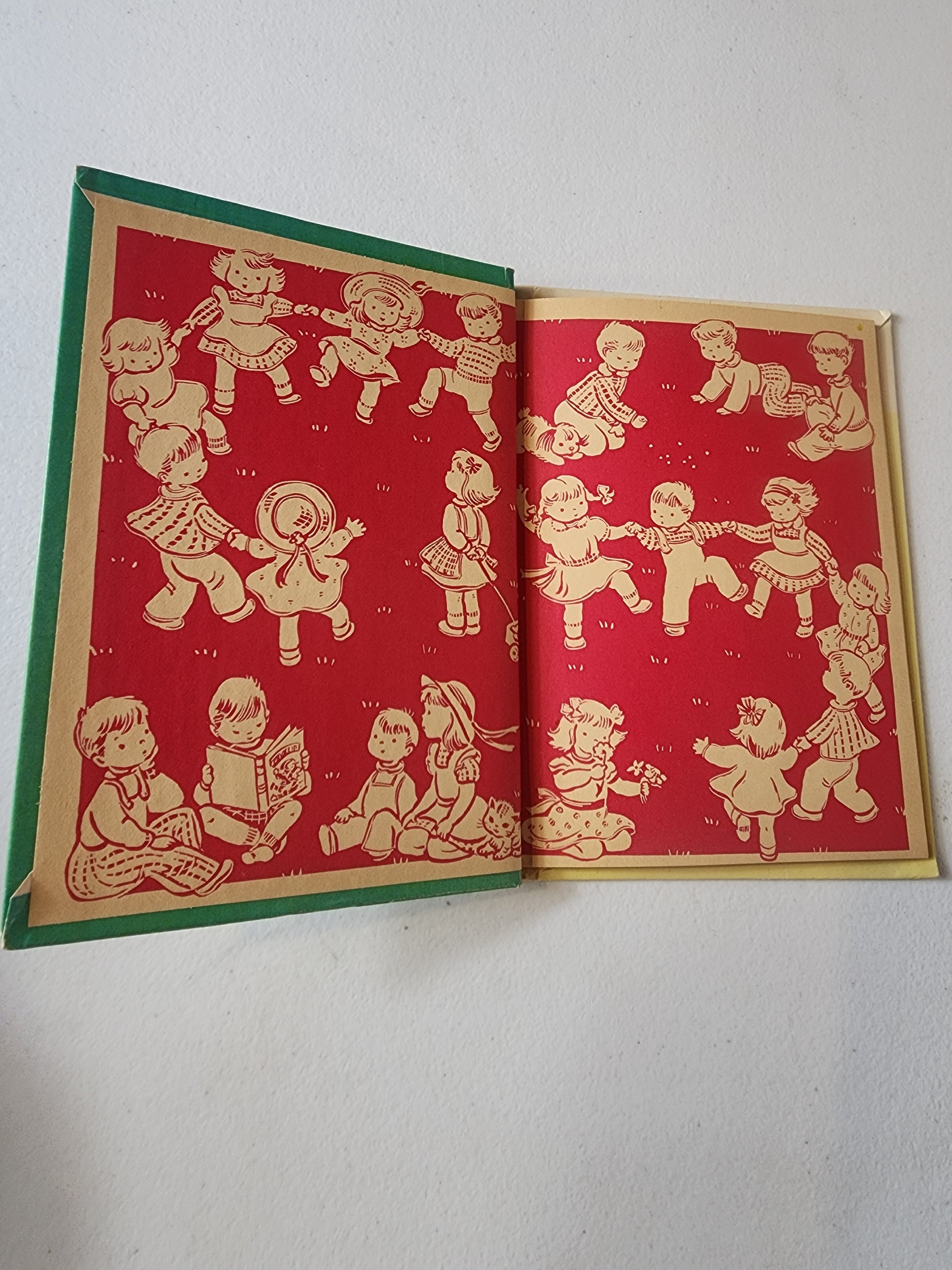 It features an illustrated cover of the "No-Good" donkey dancing with a floral garland, and vibrant interior illustrations. The inside front and back covers have charming red and white graphics of children dancing and playing. In good condition for age has slight cover wear, no writing in book, see pictures for best description.