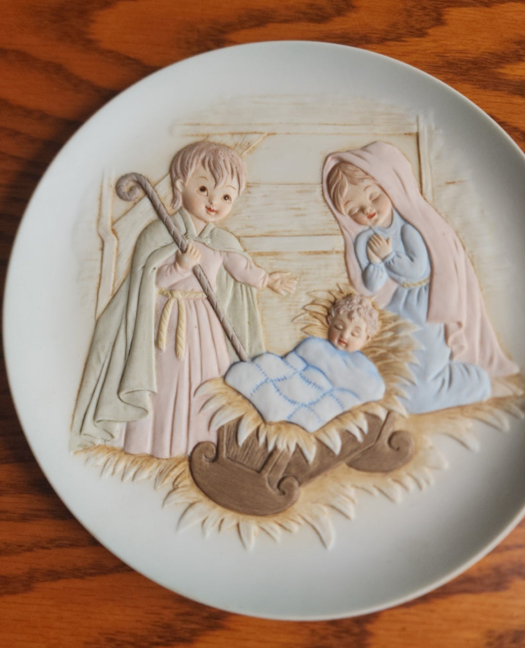 Capture the spirit of Christmas with this charming vintage 1983 Lefton Christopher Collection Nativity plate. Featuring a tender, beautifully embossed depiction of the Holy Family, this 7.5" diameter decorative plate is in good condition and makes a wonderful addition to any holiday display or collector's treasury. A timeless piece to cherish for generations. SKU: cube10"