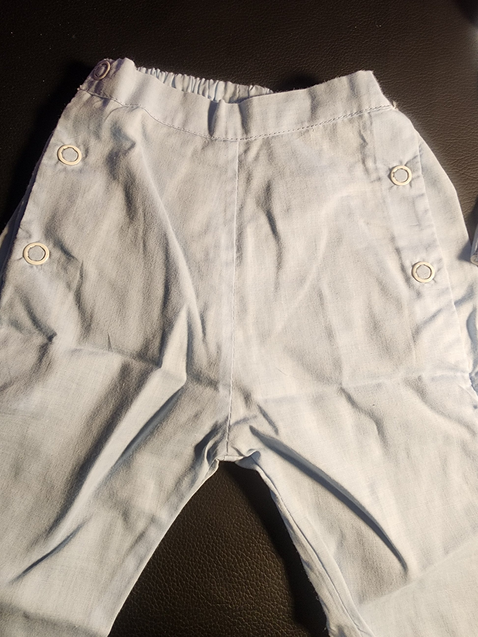 <span;>Baby boys blue newborn outfit. features a vest-style top with a white collar, pearl buttons, and small decorative pockets. The outfit also includes matching pants with attached feet and snap closures on the side. The material appears to be a light cotton , and the overall style suggests it is from the mid-20th century, possibly the 1960s. The outfit is designed for a newborn, as indicated by the attached feet and small size. The light blue color and classic design are typical of baby clothing from that era. The bow tie is attached .The tag has been cut out. The outfit is in very good condition.