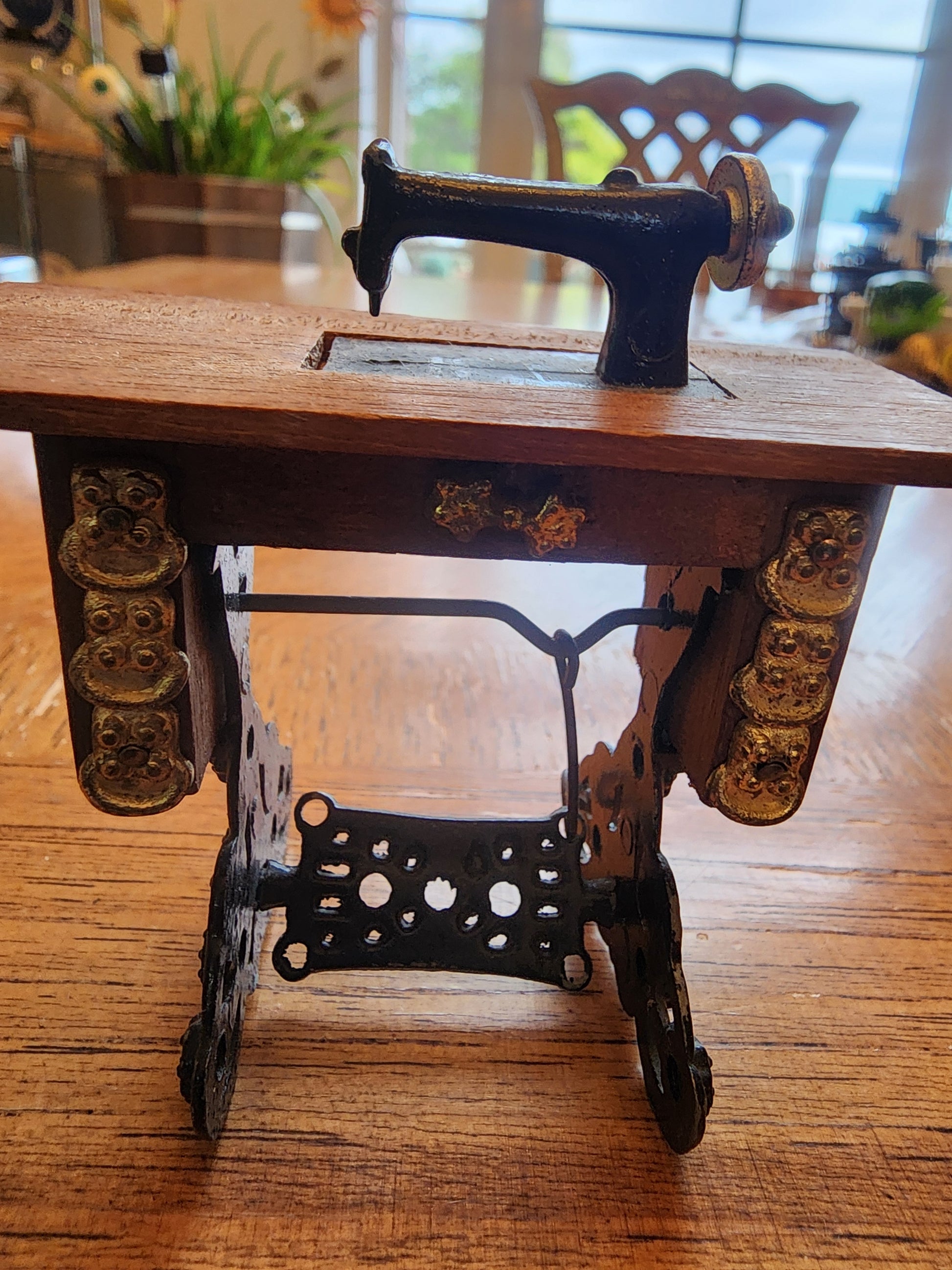 Vintage miniature sewing machine & cabinet for dollhouse 3 1/8" long. The cabinet stands aprox. 2 1/8" tall, in good condition.