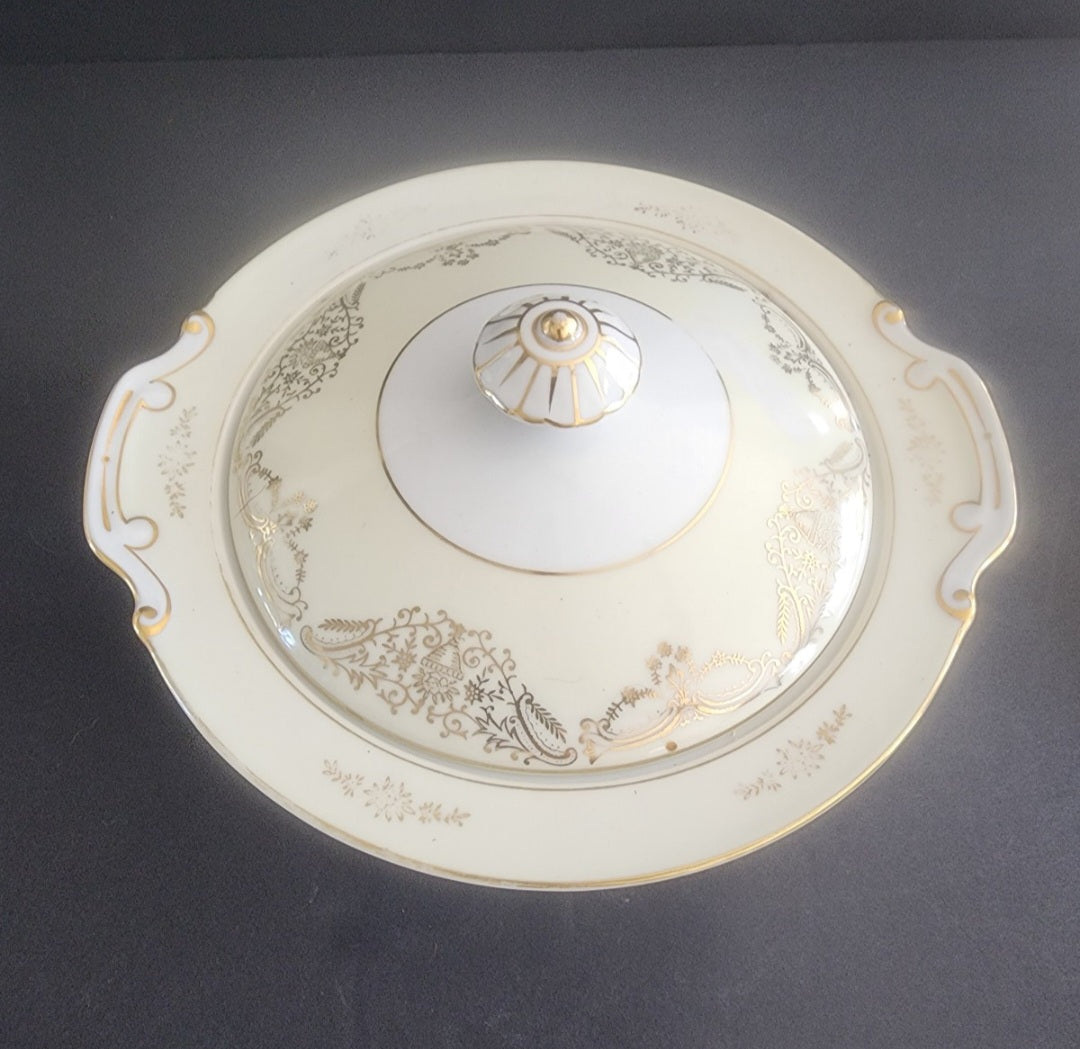 Add a touch of 1920s sophistication to your table or china cabinet with this beautiful covered vegetable dish (tureen). Featuring intricate gold detailing and a classic cream finish, this piece is a wonderful example of early 20th-century Japanese craftsmanship.