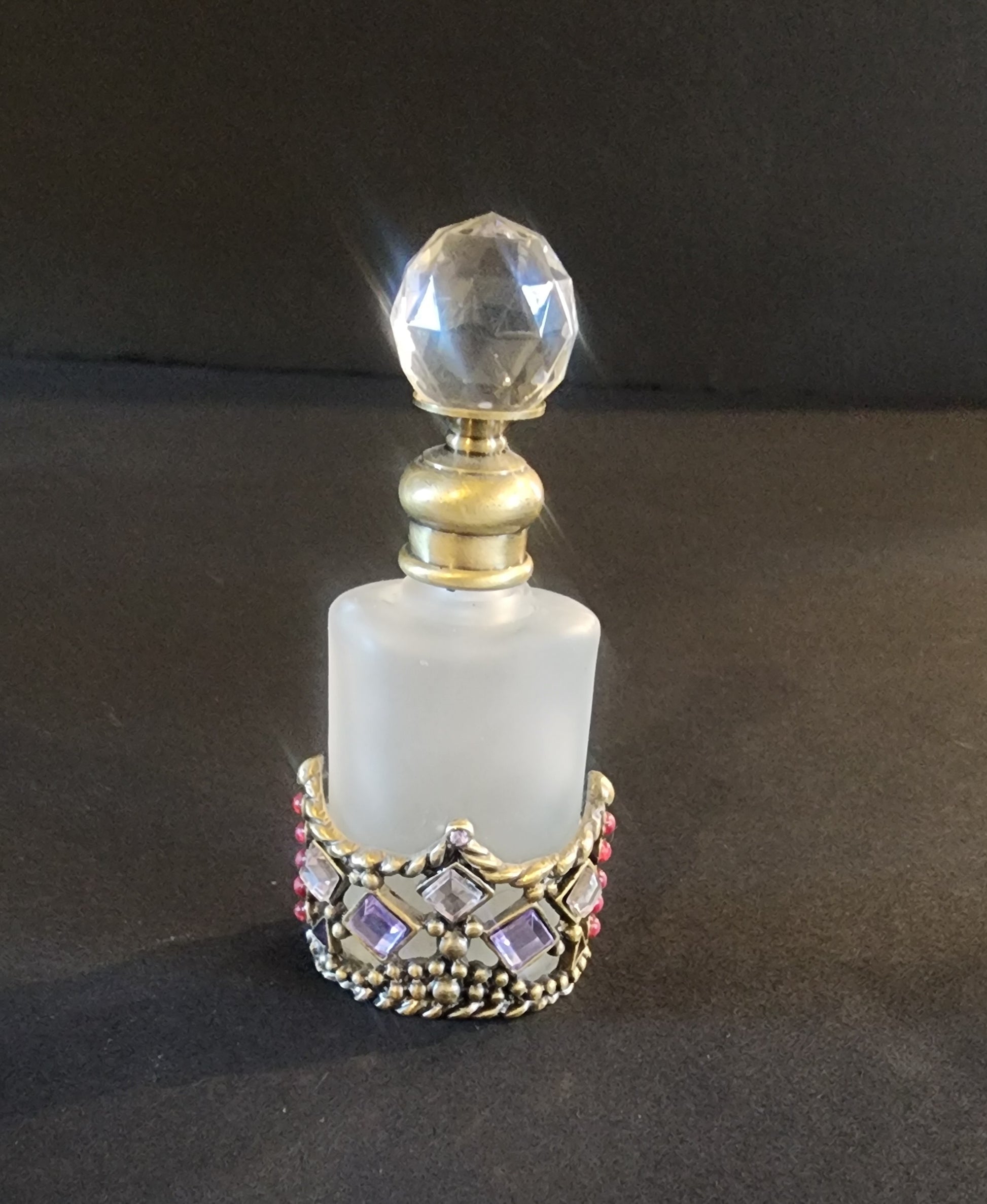 Vtg Perfume Bottle Decanter Rhinestones Purple Pink Jewels Refillable Frosted aprox 3.50" tall In very good condition.